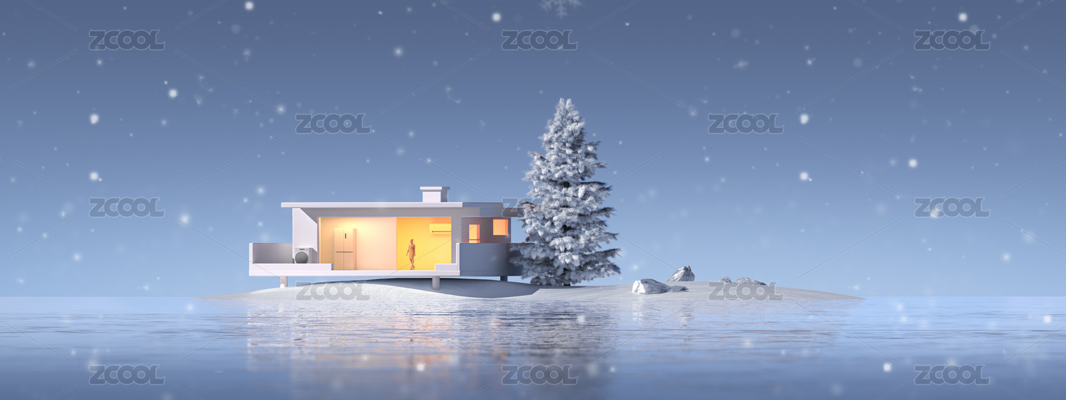 海上小島孤島小屋暖光概念季節(jié)藍(lán)色3D海報(bào)