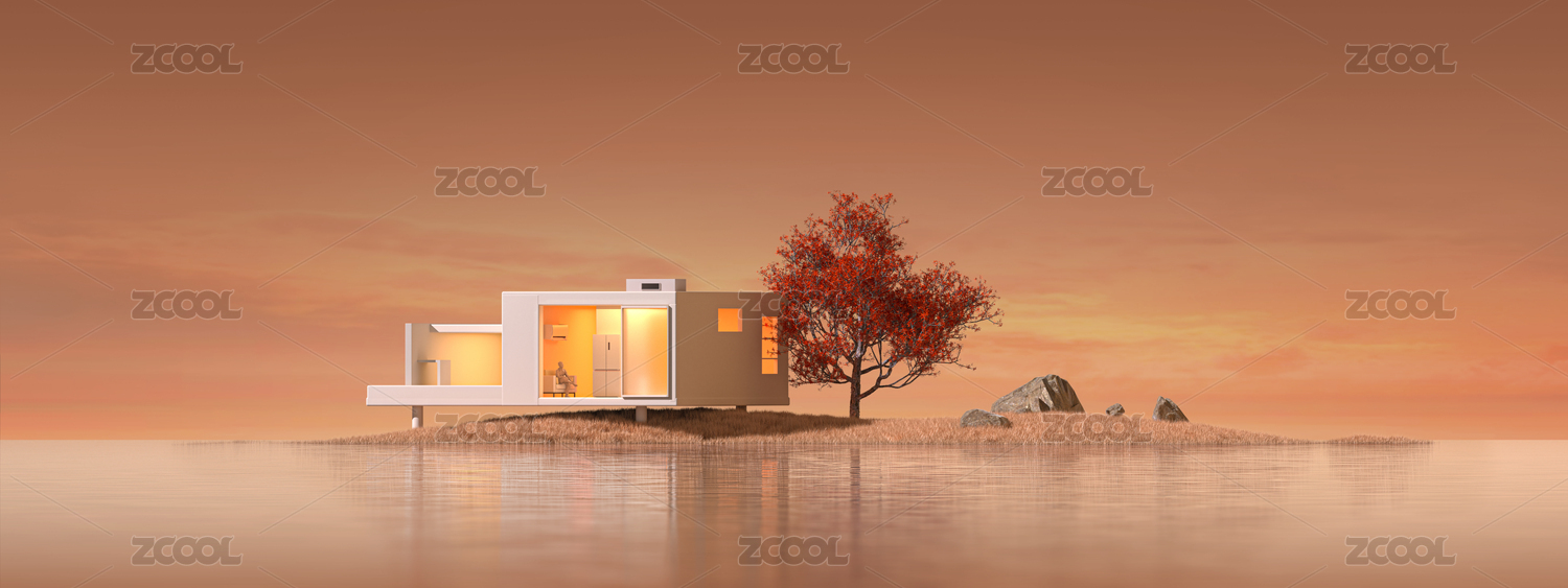 海上小島孤島小屋暖光概念季節(jié)棕色3D海報(bào)
