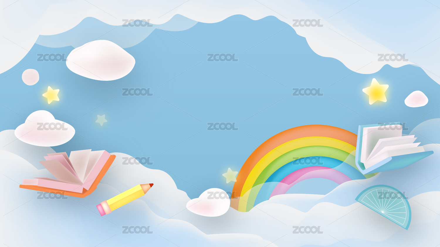 藍(lán)天白云中的書本和鉛筆的卡通插圖