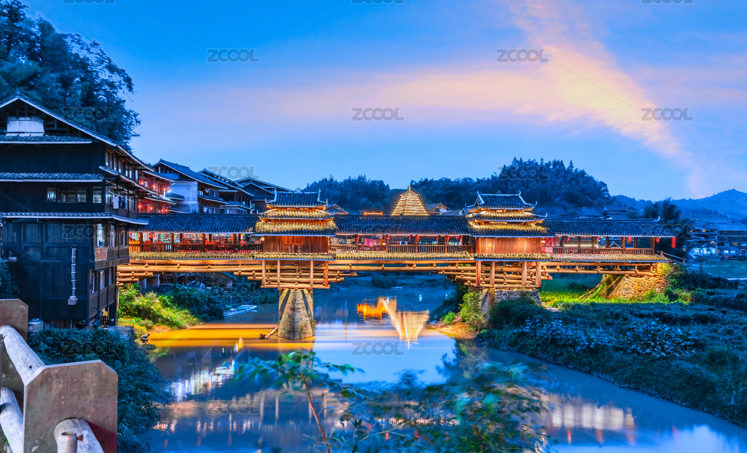 廣西柳州三江程陽八寨風(fēng)雨橋建筑夜景全貌