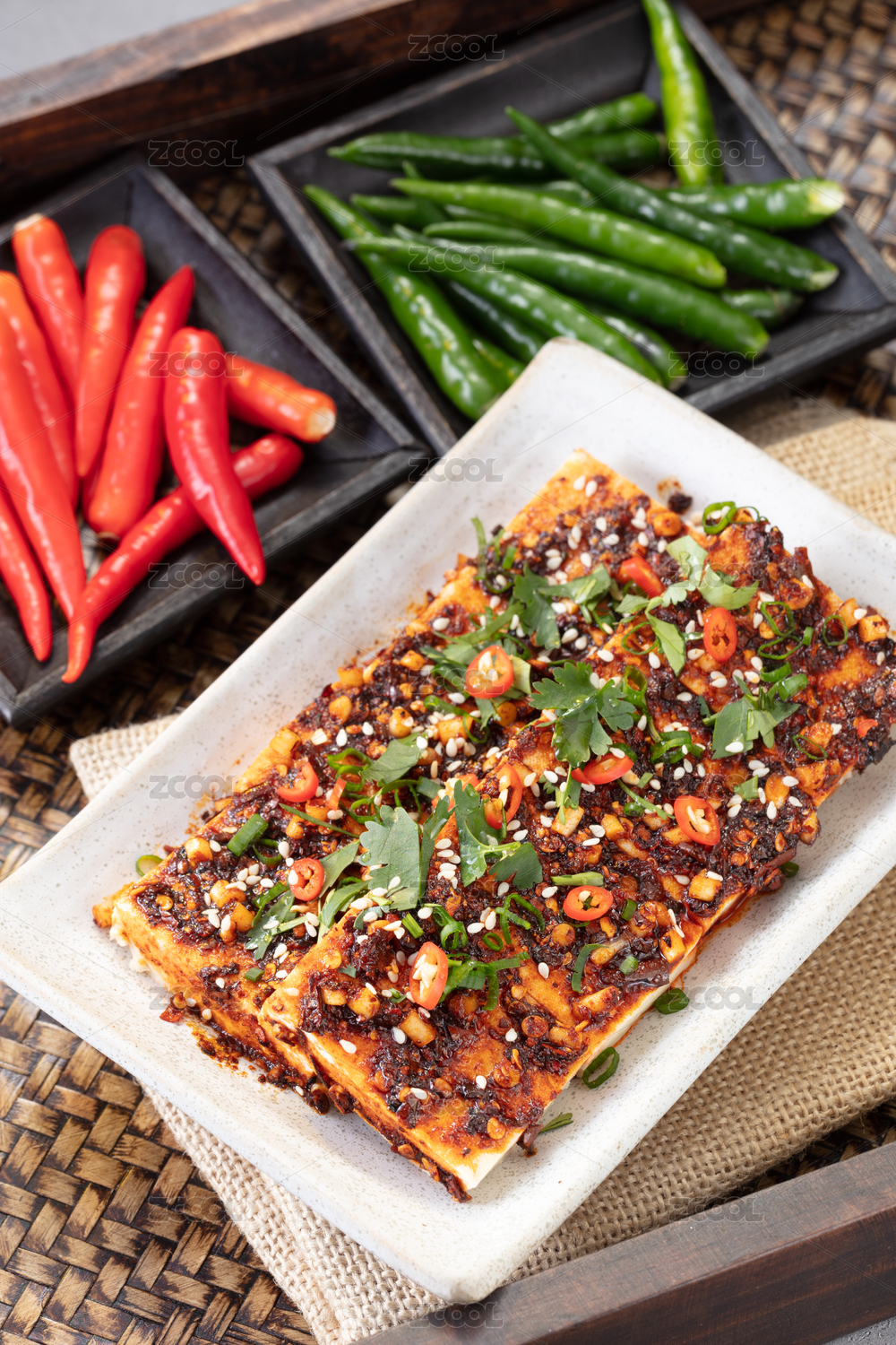 木盒里麻布上長方盤里的麻辣豆腐塊