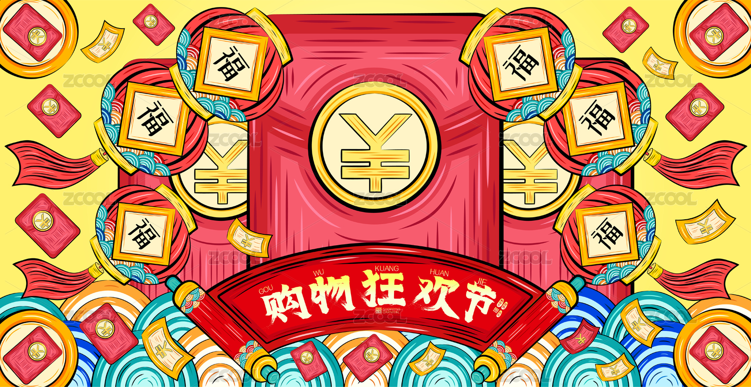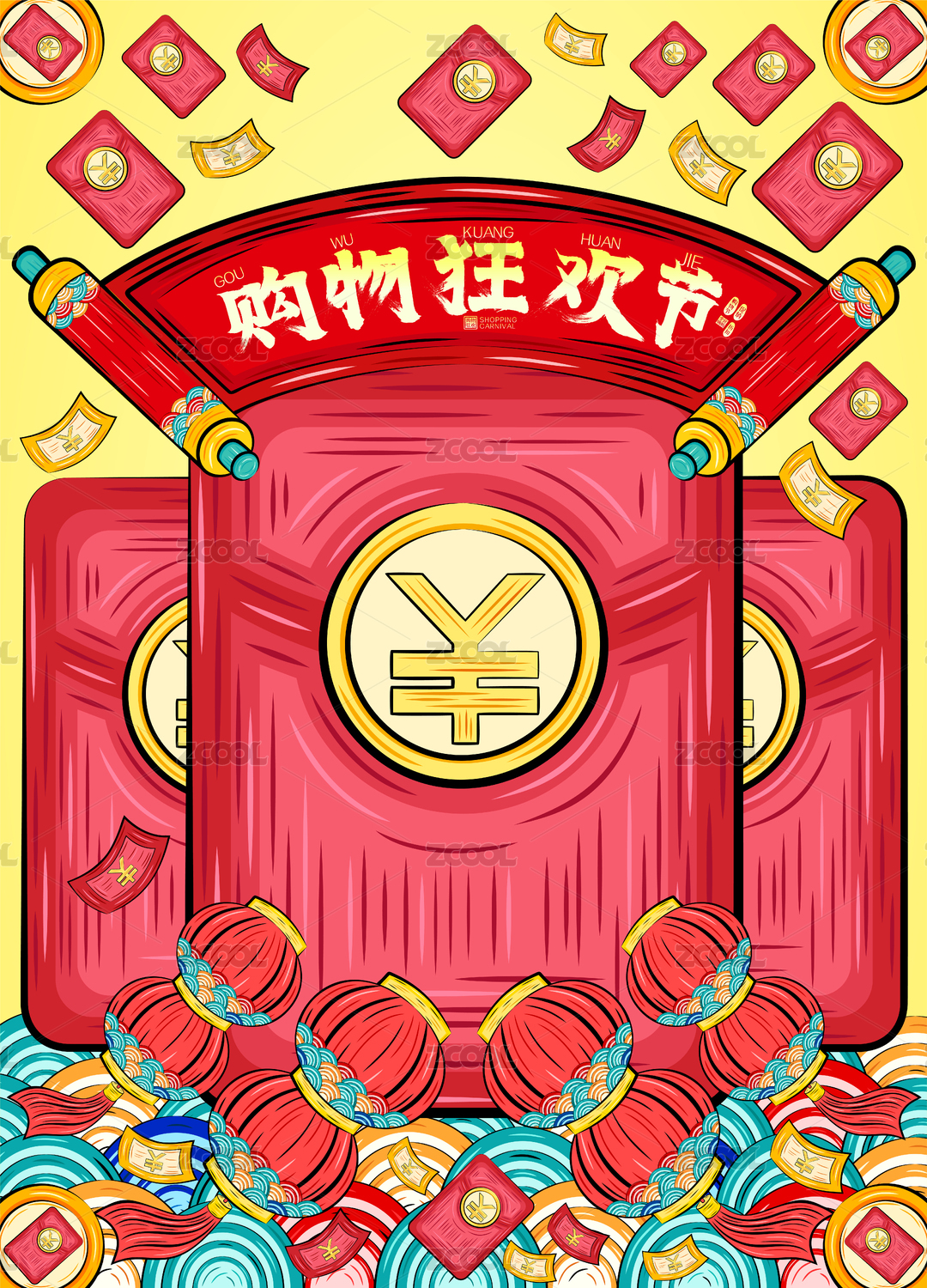 購物狂歡節(jié)國潮紅包雨歡慶燈籠送福矢量插畫
