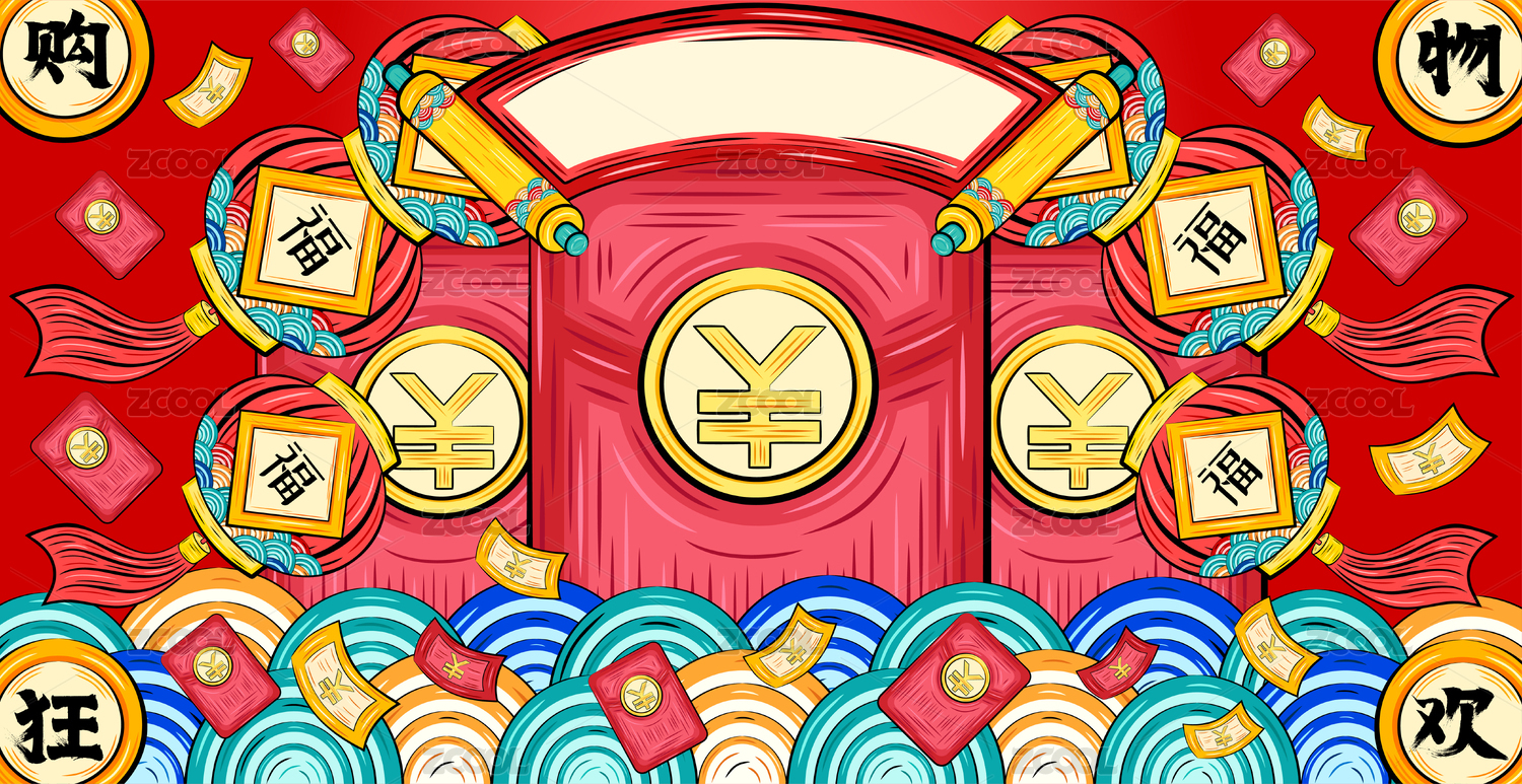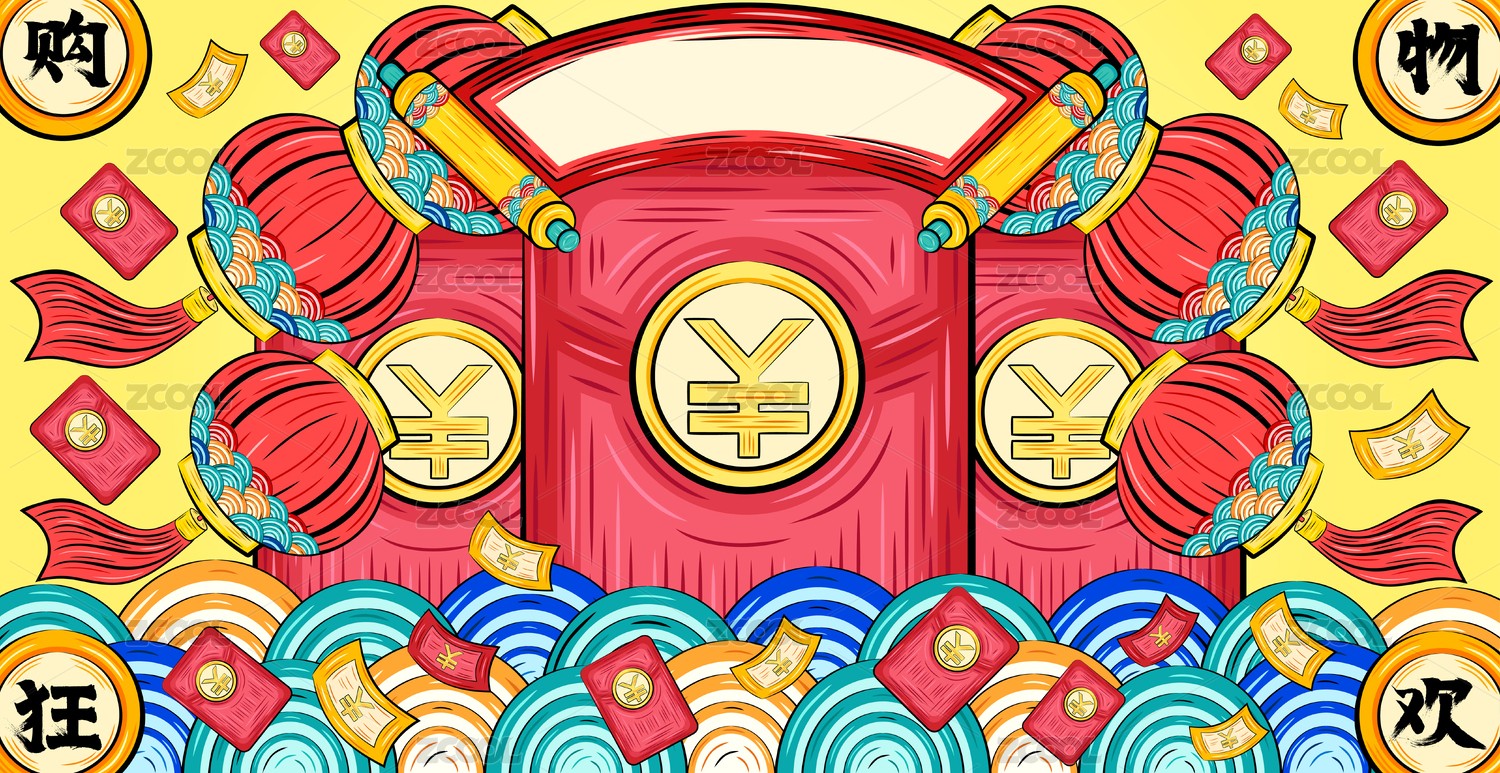 國潮紅包雨慶賀燈籠賜福購物狂歡矢量插畫