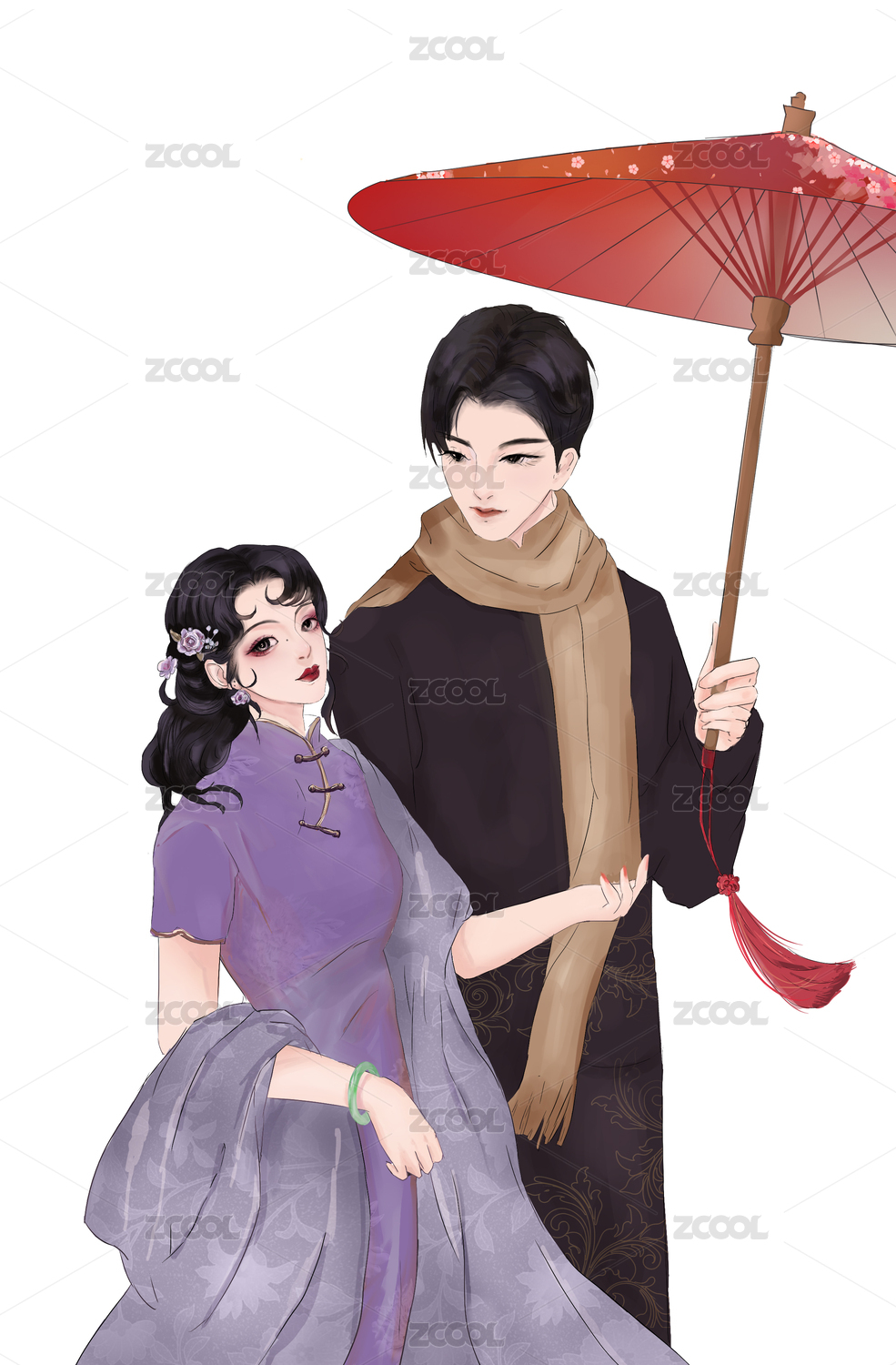 民國(guó)打傘情侶插畫(huà)白底