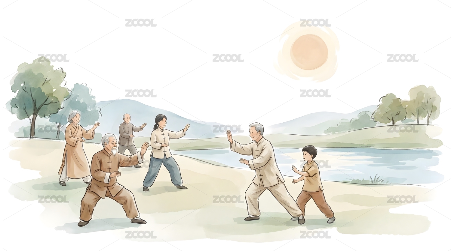 清晨湖畔老少共練太極