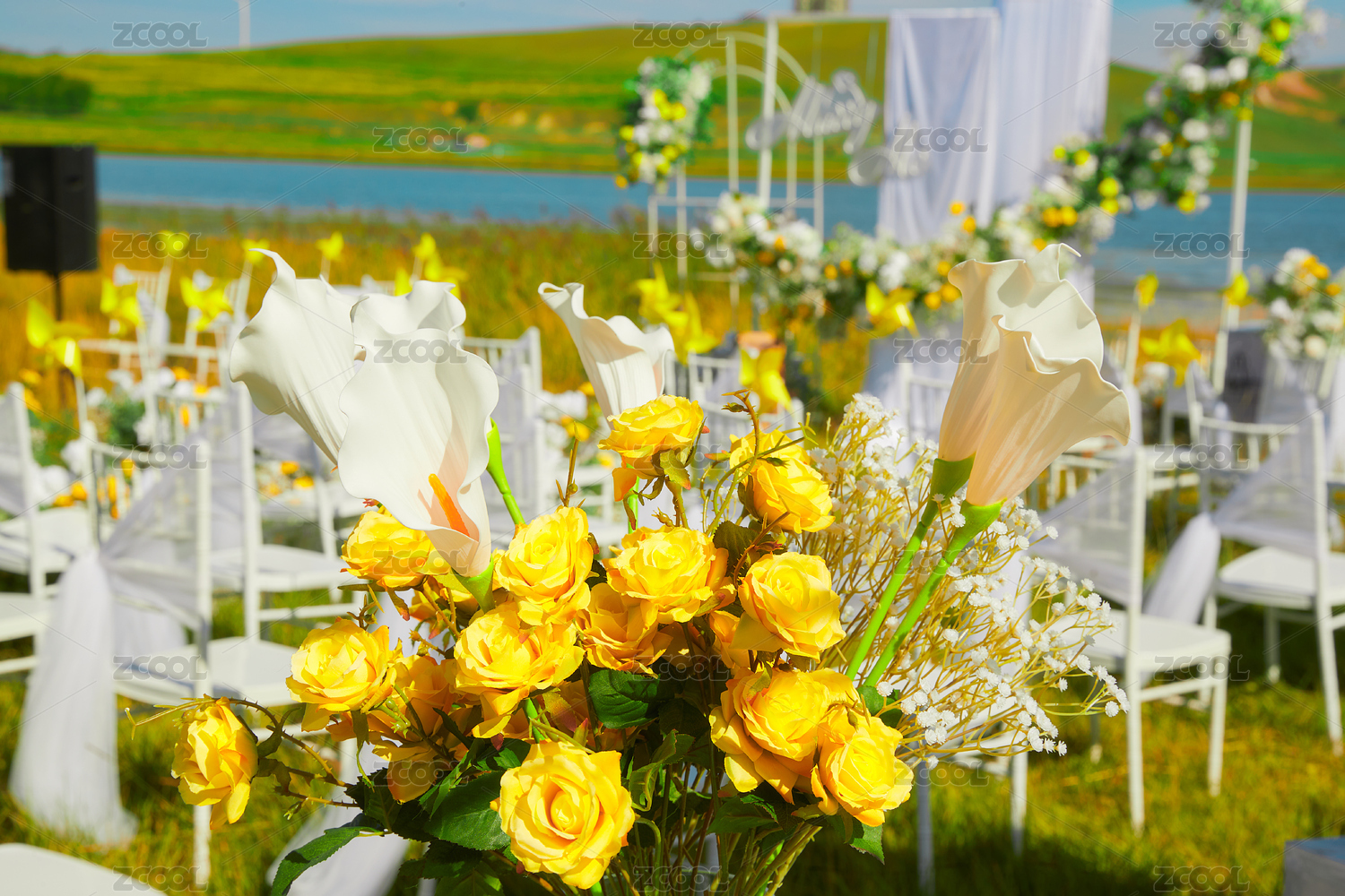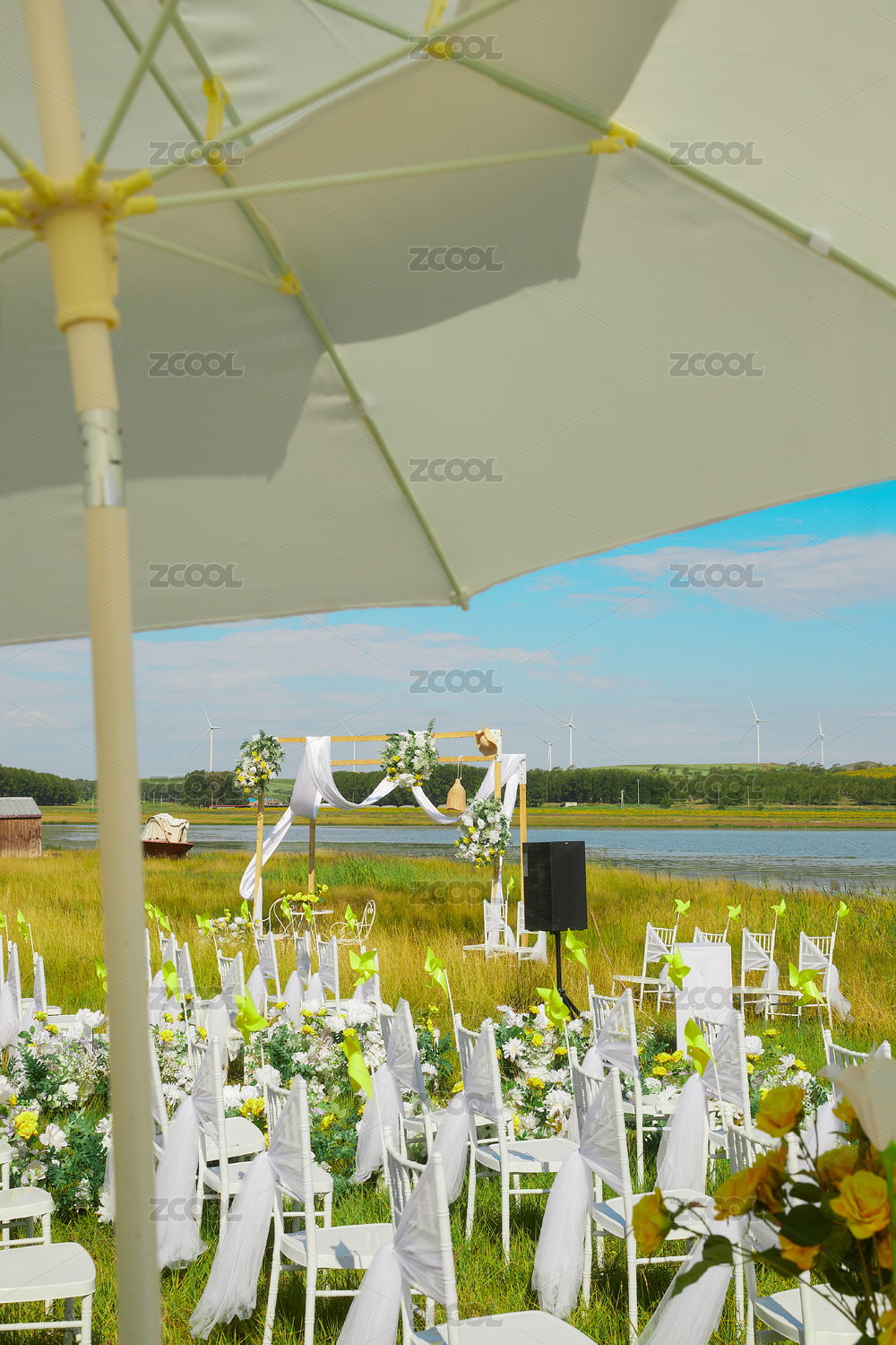 湖畔晴空下浪漫草坪婚禮的場(chǎng)地布置細(xì)節(jié)