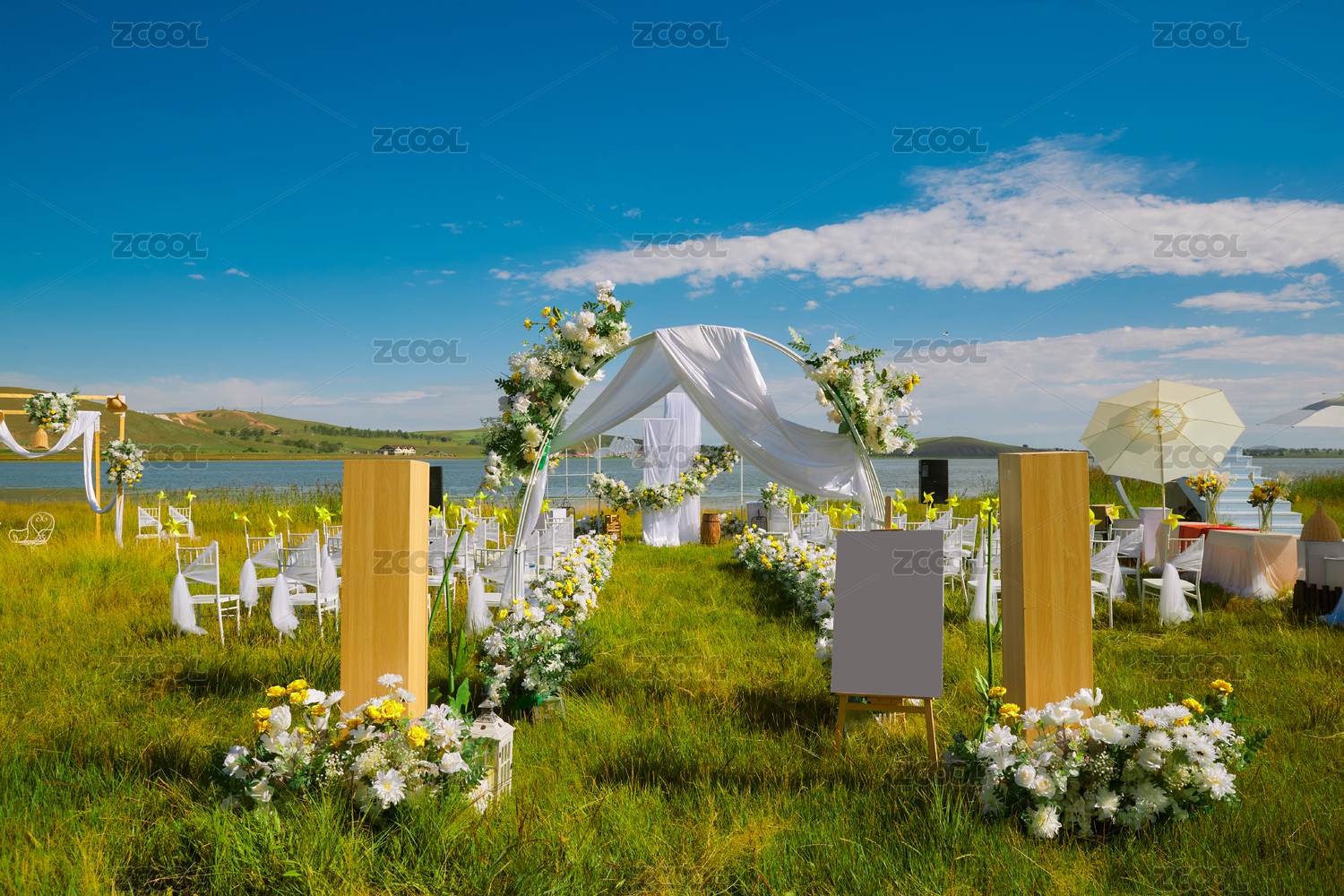 湖畔晴空下浪漫的草坪婚禮布場(chǎng)