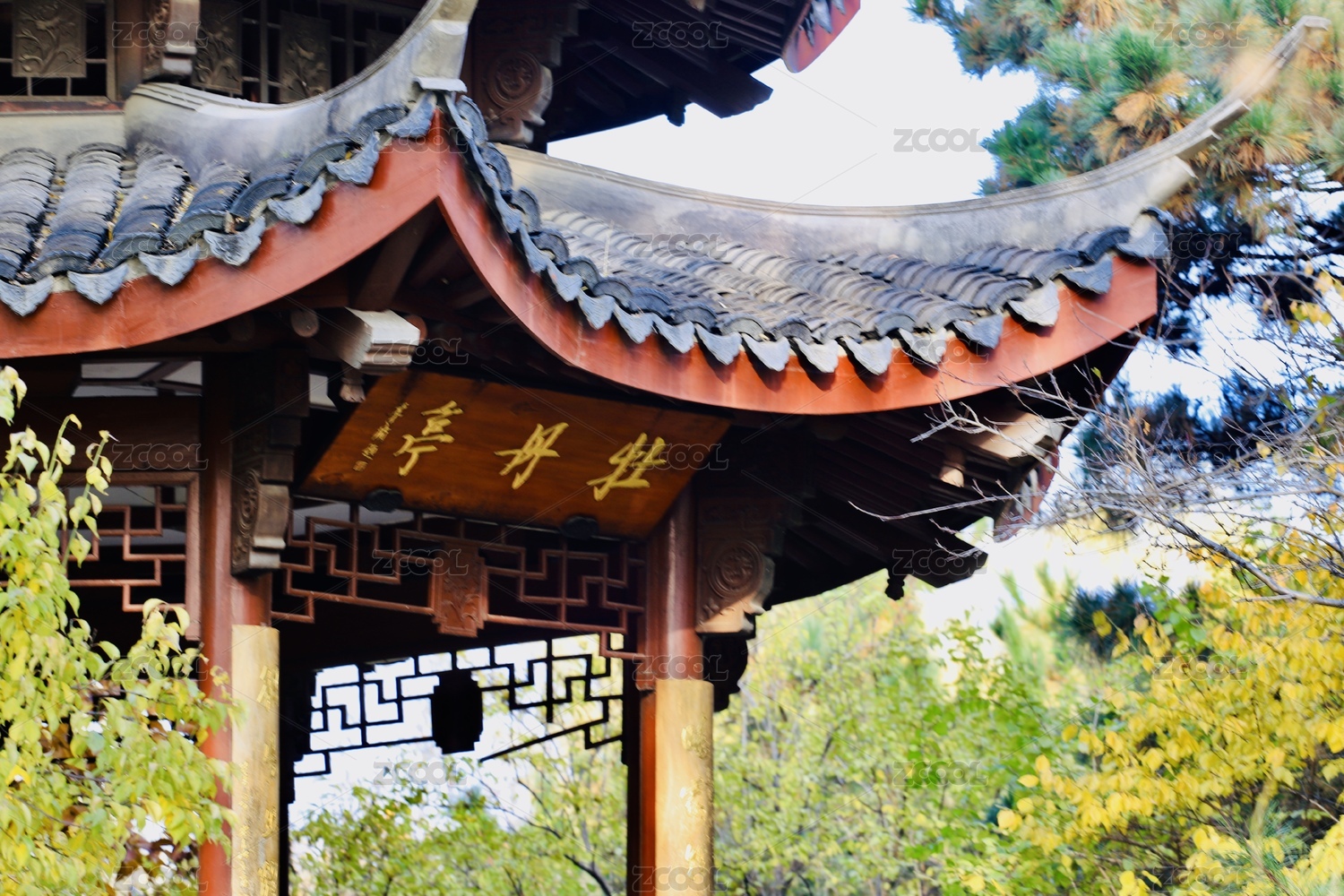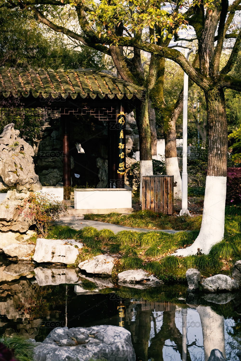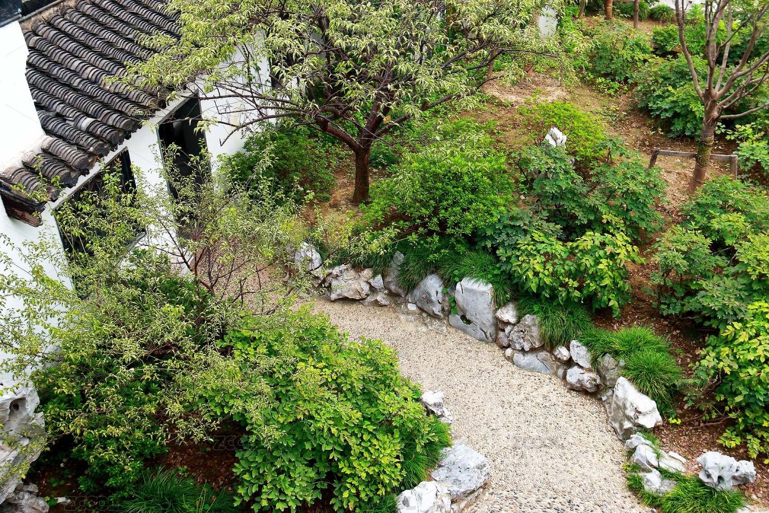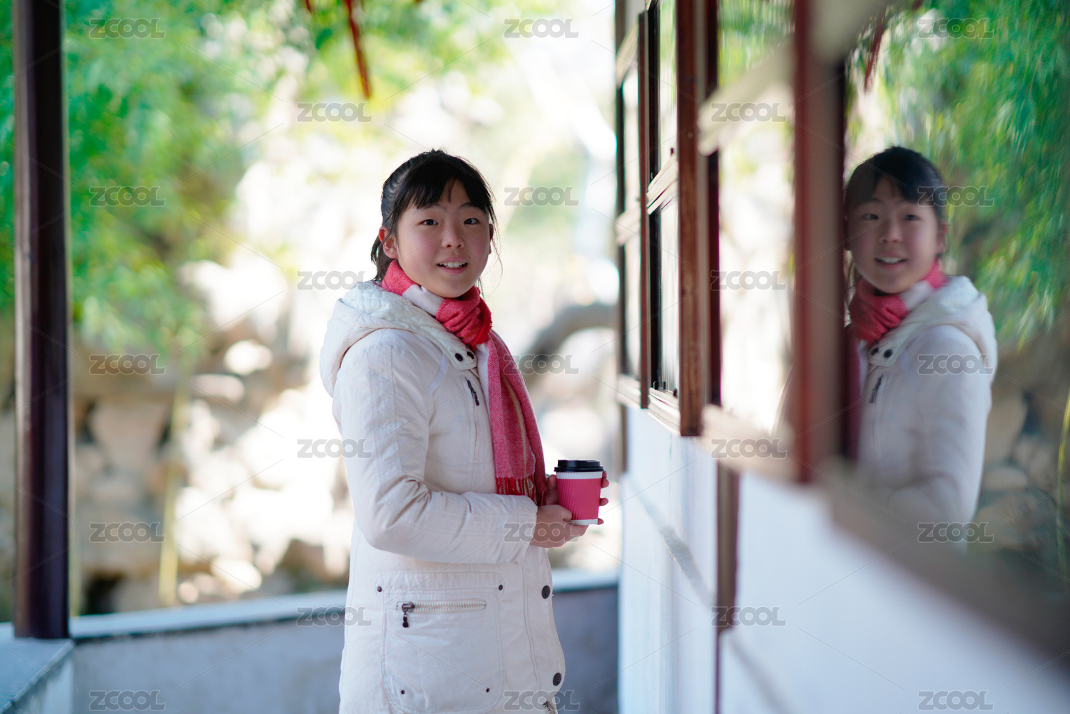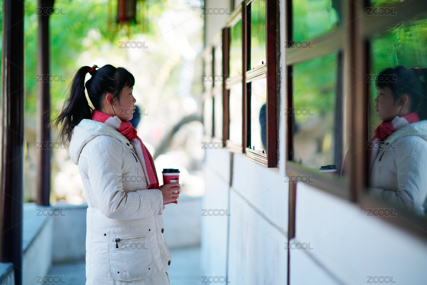 身穿白色風(fēng)衣正在觀賞江南園林的少女