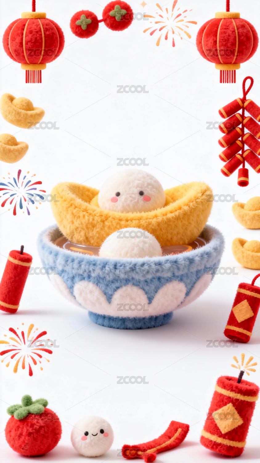 喜慶元宵節(jié)湯圓元寶與燈籠元素短絨風格