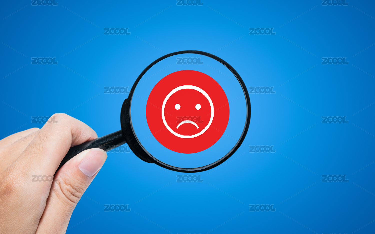 放大鏡觀察到一個(gè)失落的失望的臉部表情表示差評(píng)惡評(píng)失信人員