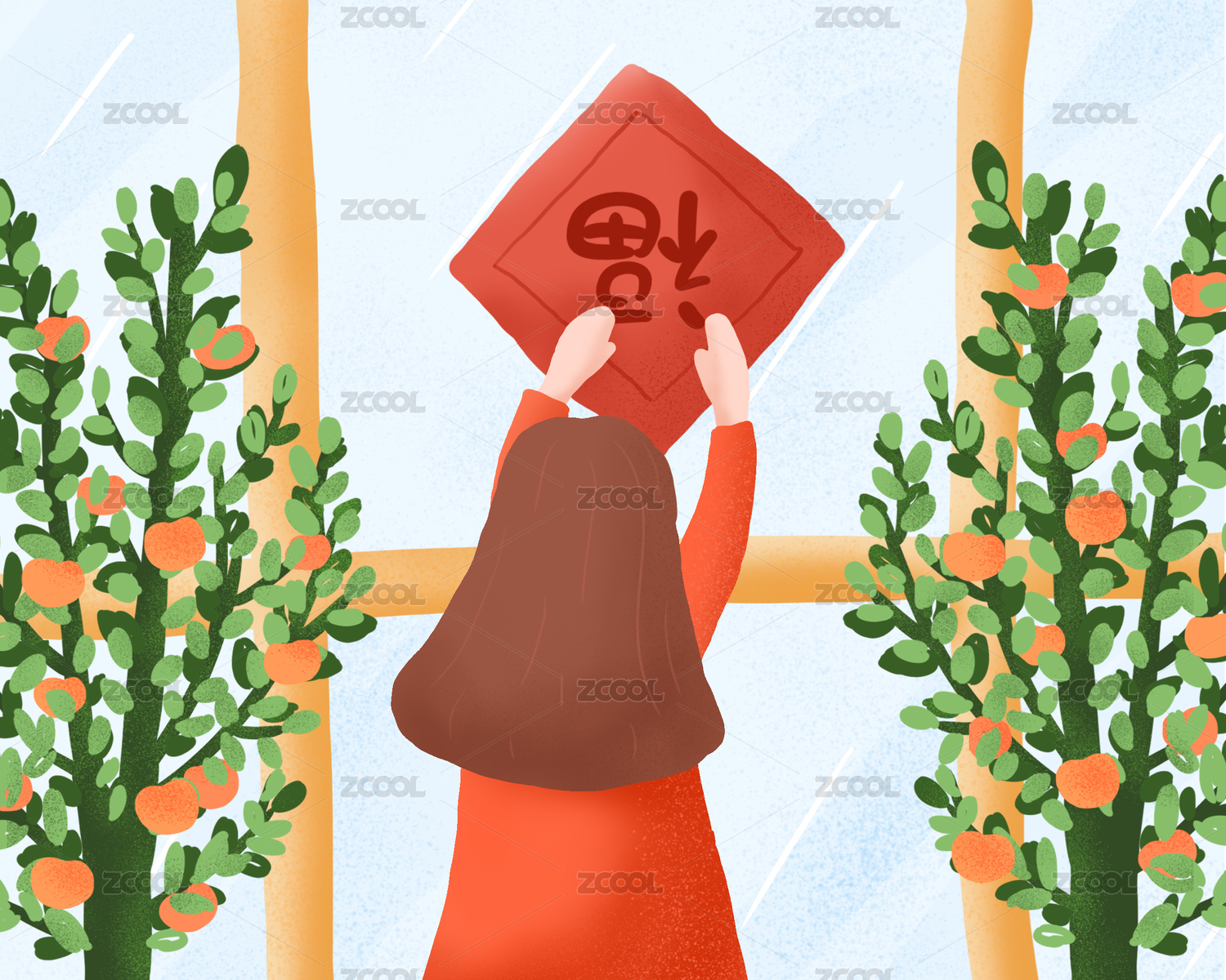 春節(jié)除夕新年小女孩貼福字掛燈籠手繪插畫