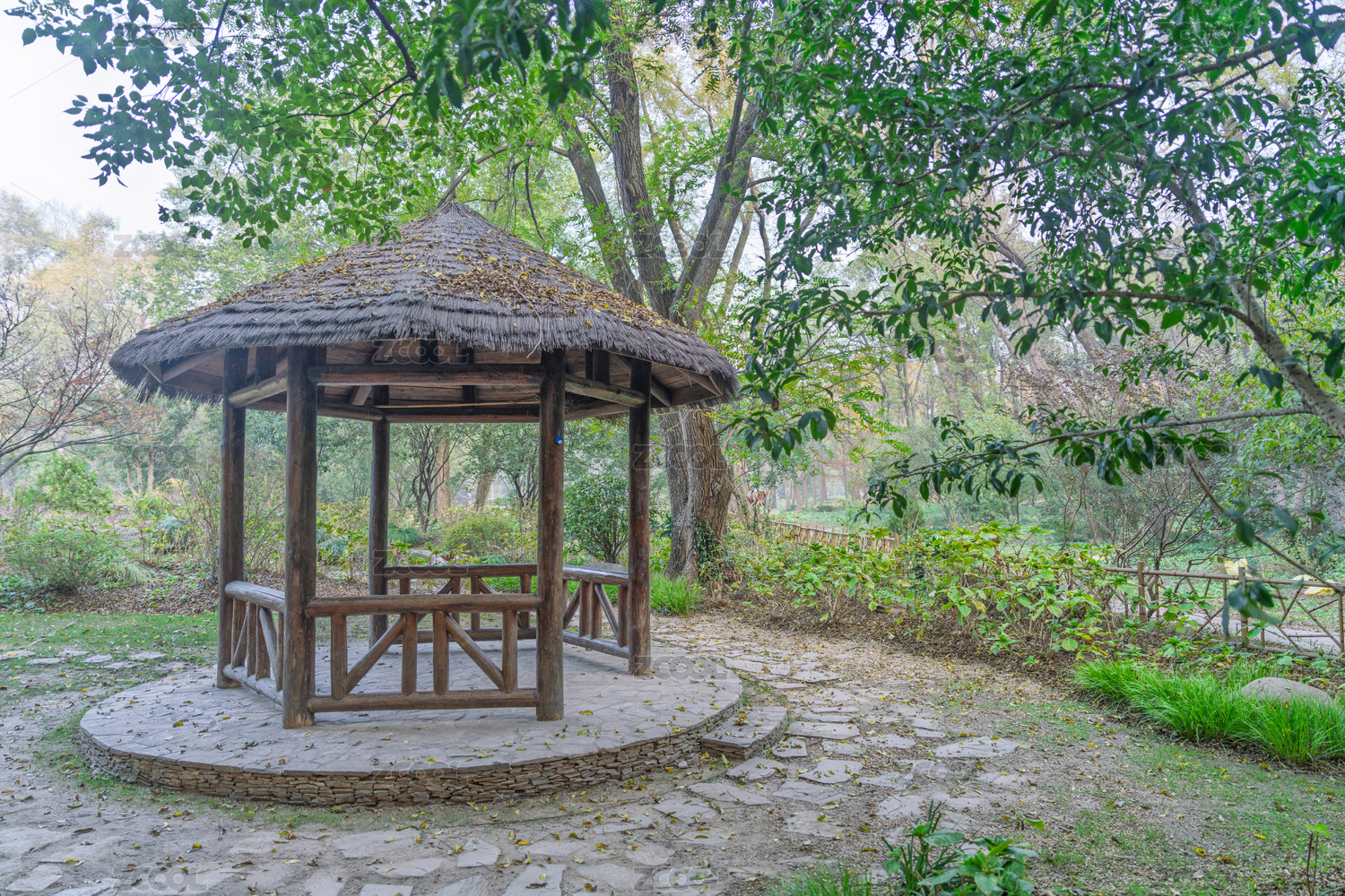 秋天秋雨過后的城市公園里的水杉林與石徑