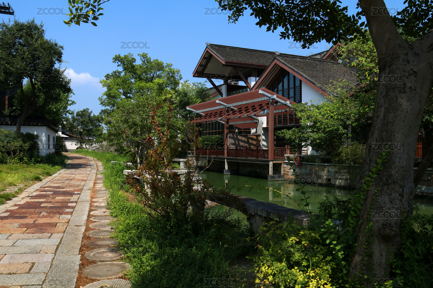 藍(lán)天下的綠蔭石徑與碧波中的棕色雅居