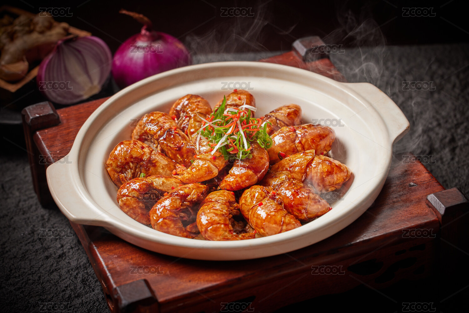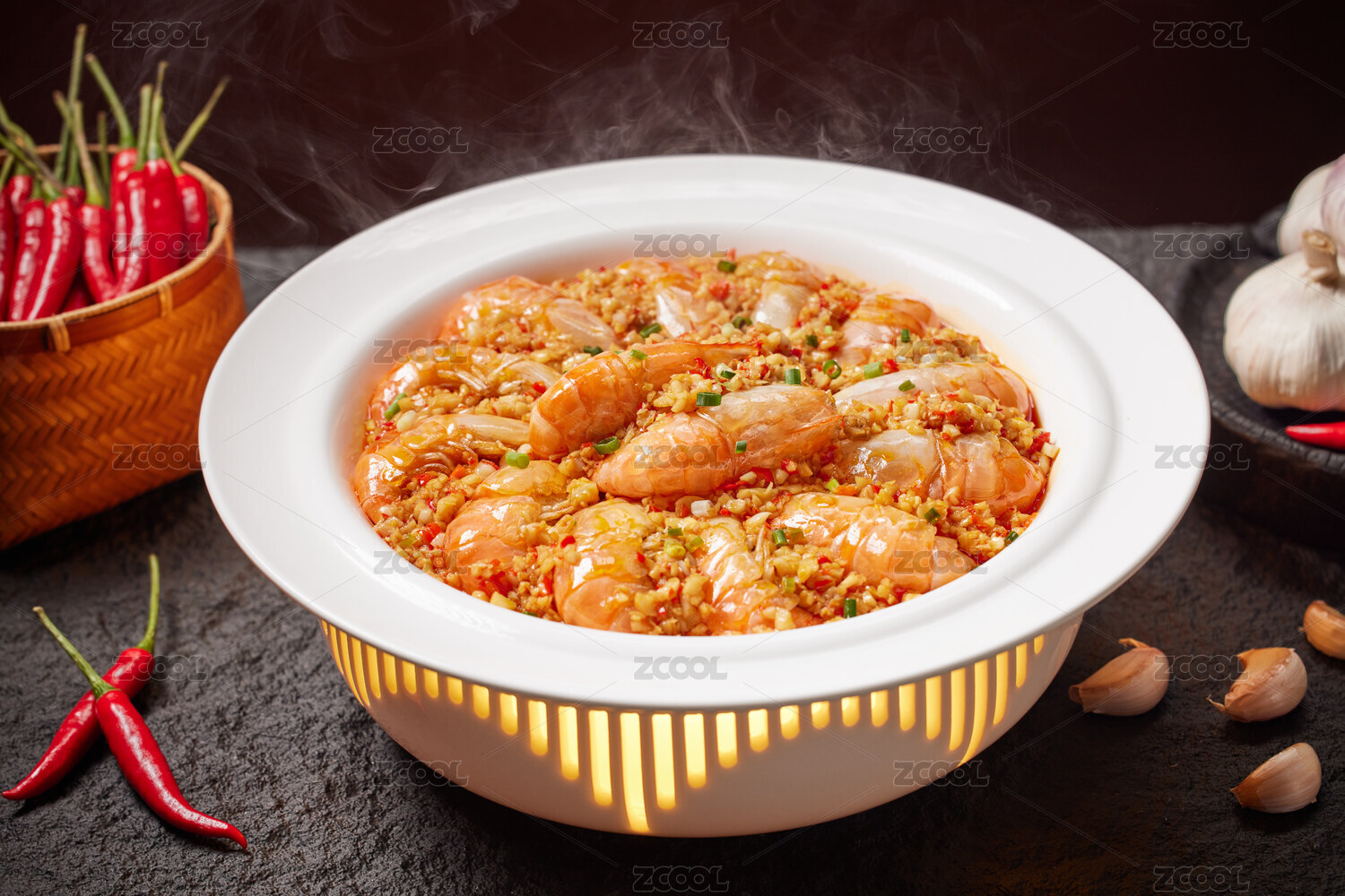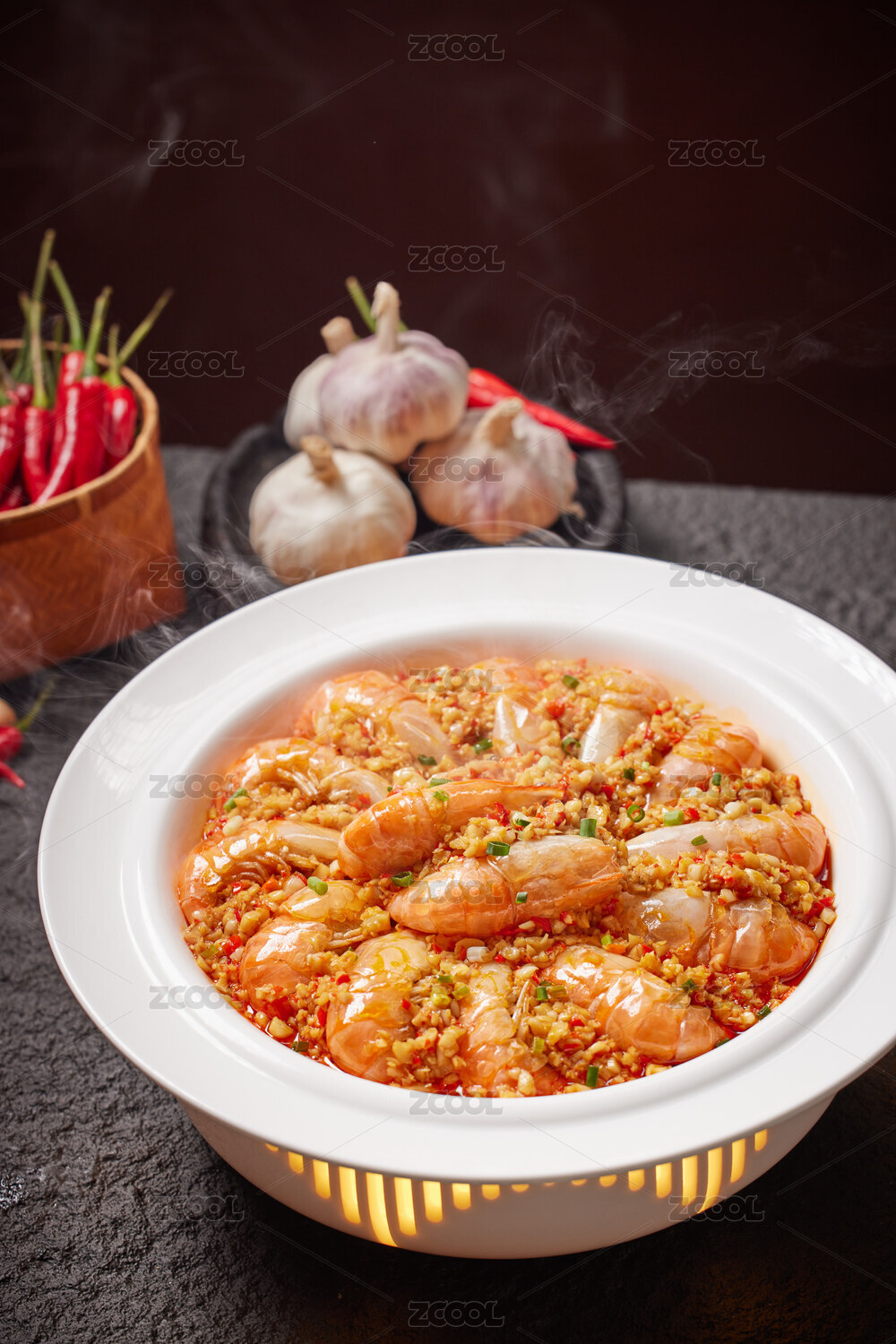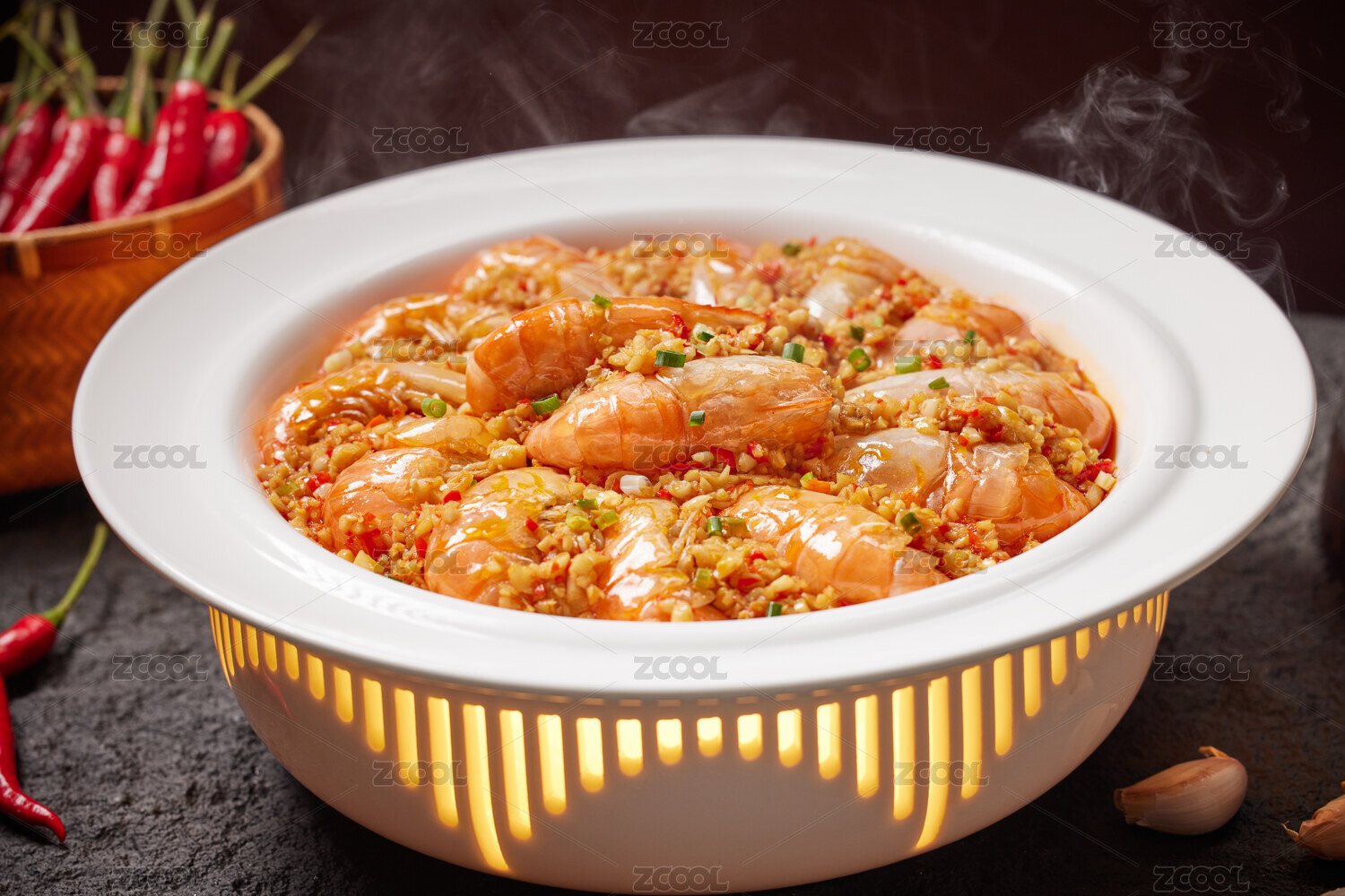 深色背景上一盆蒜蓉做法的海鮮羅氏蝦