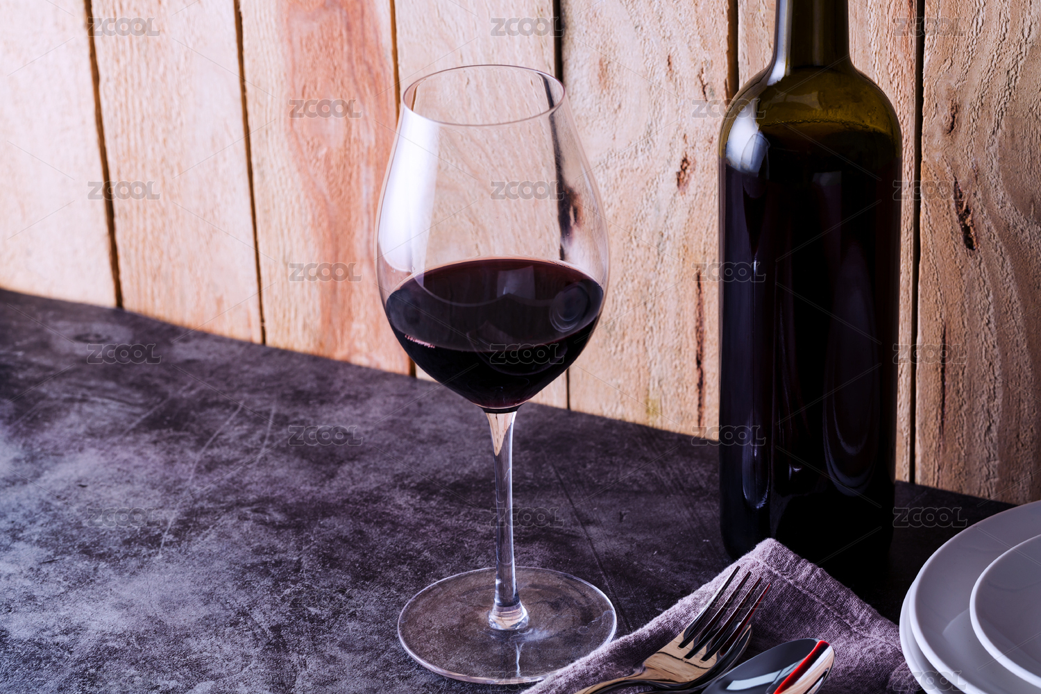 一瓶紅酒和一杯紅酒以及餐具在桌子上