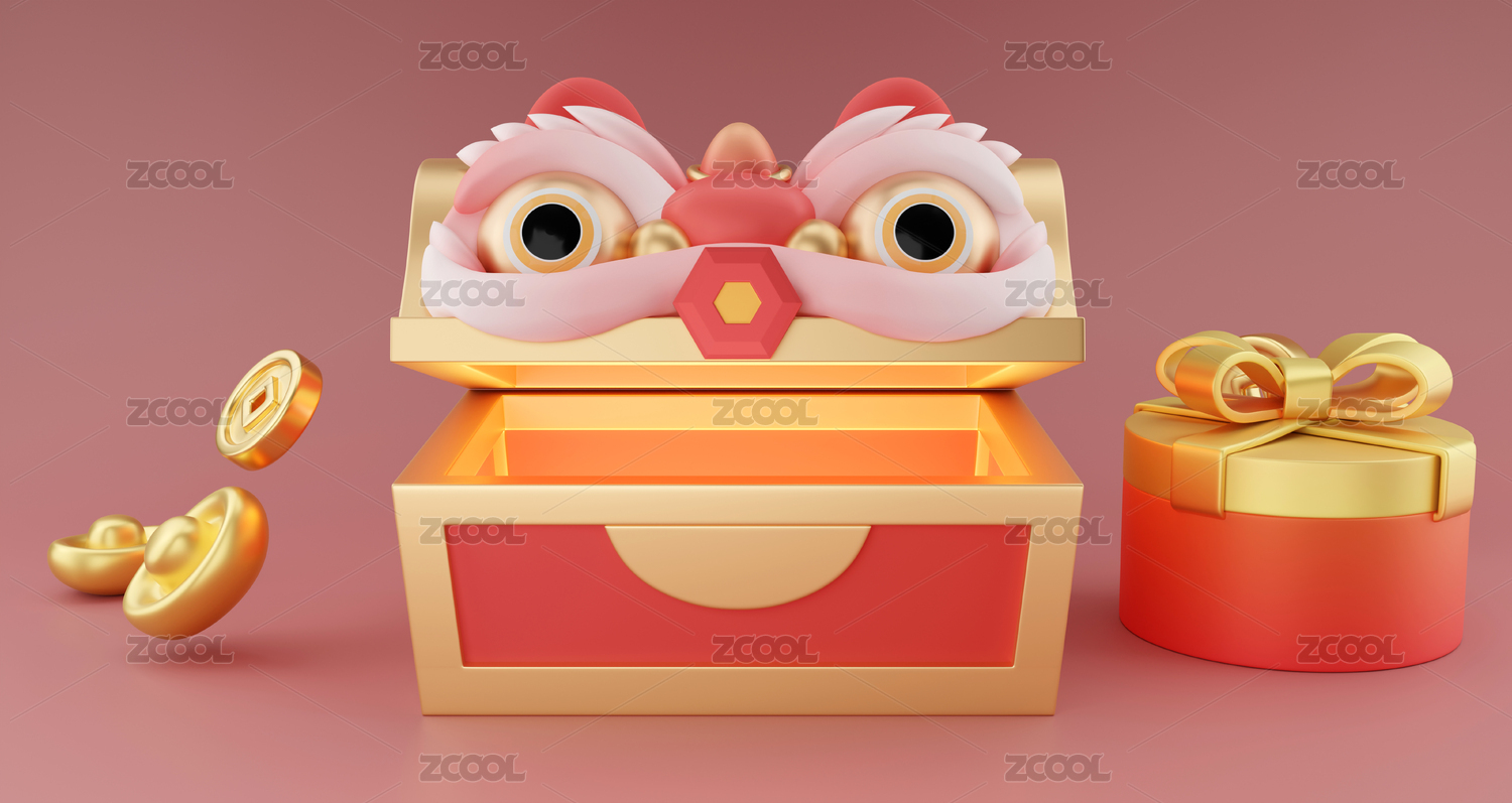 打開(kāi)的創(chuàng)意可愛(ài)卡通獅子頭質(zhì)感游戲立體寶箱