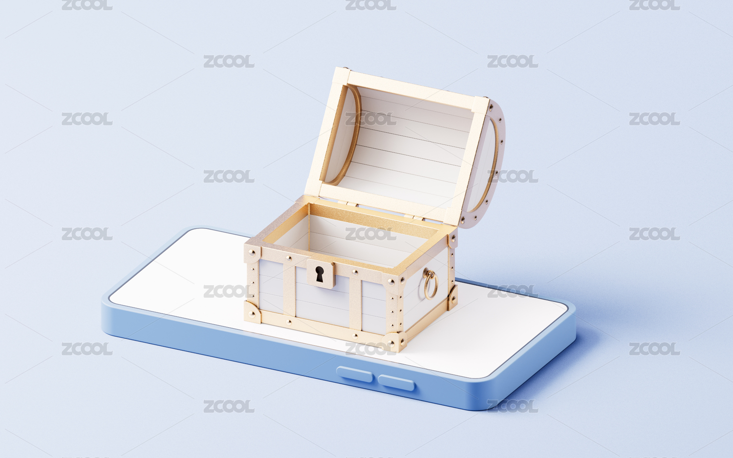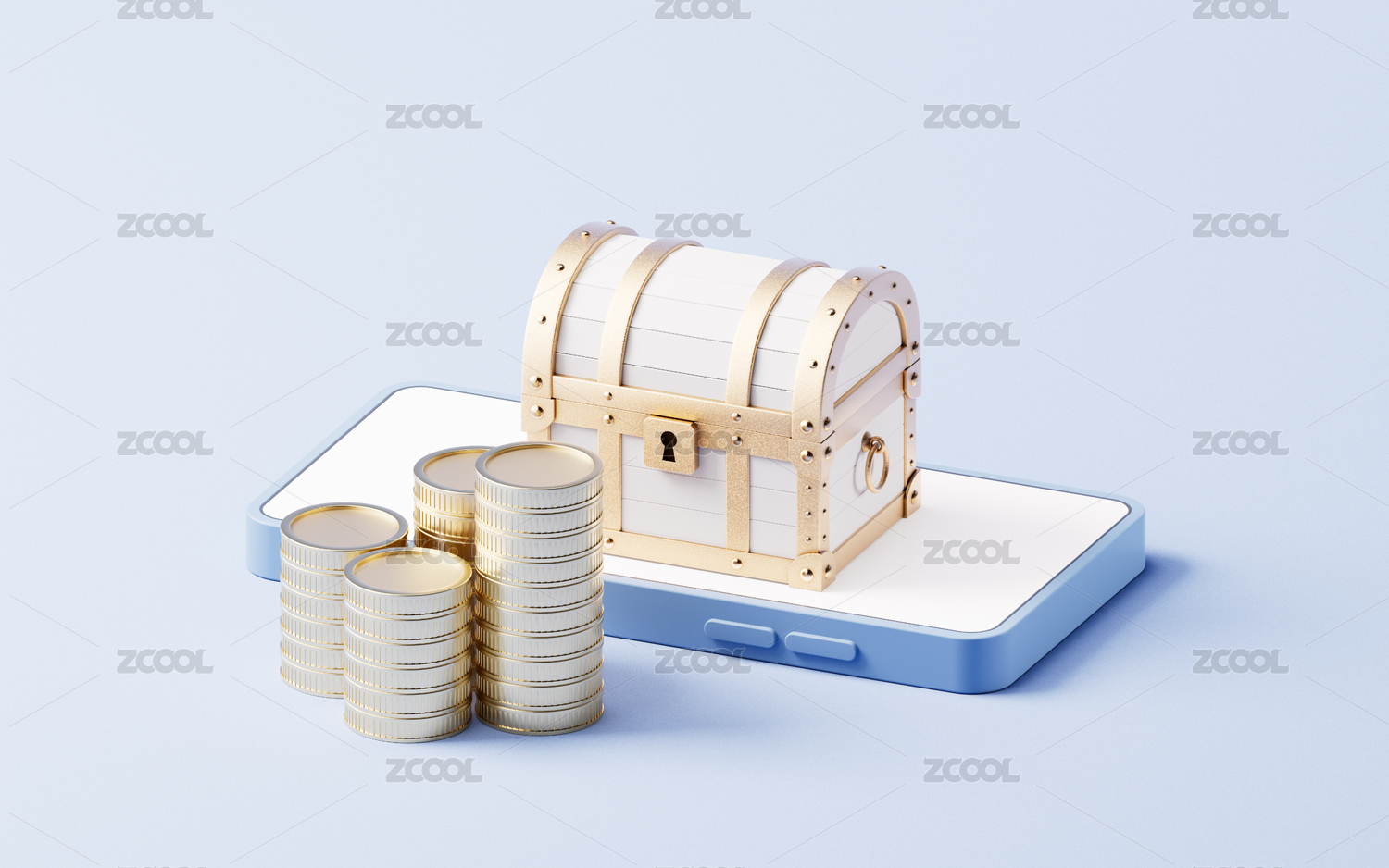 卡通風(fēng)格黃金寶箱寶藏與手機(jī)三維渲染