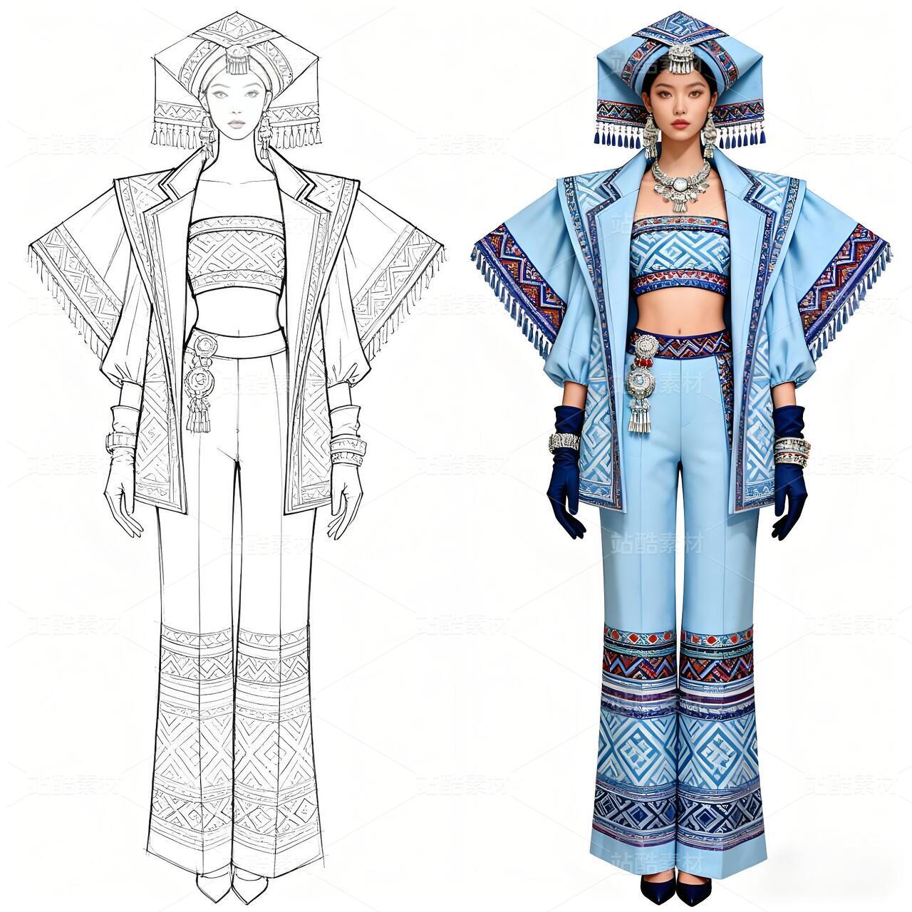 高定藍色苗族扎染禮服設(shè)計手稿+敦煌風格