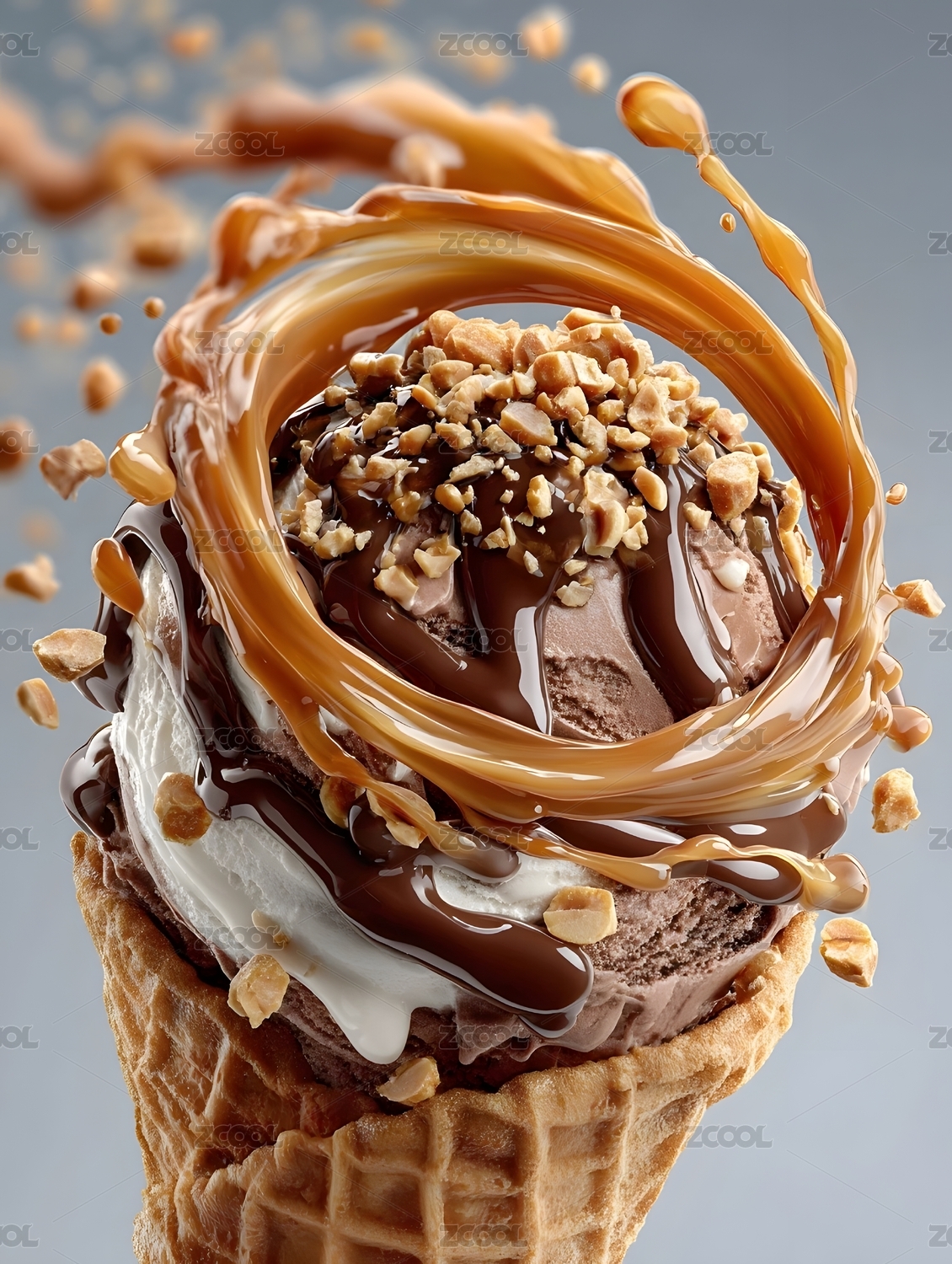 冰淇淋甜筒巧克力醬飛濺