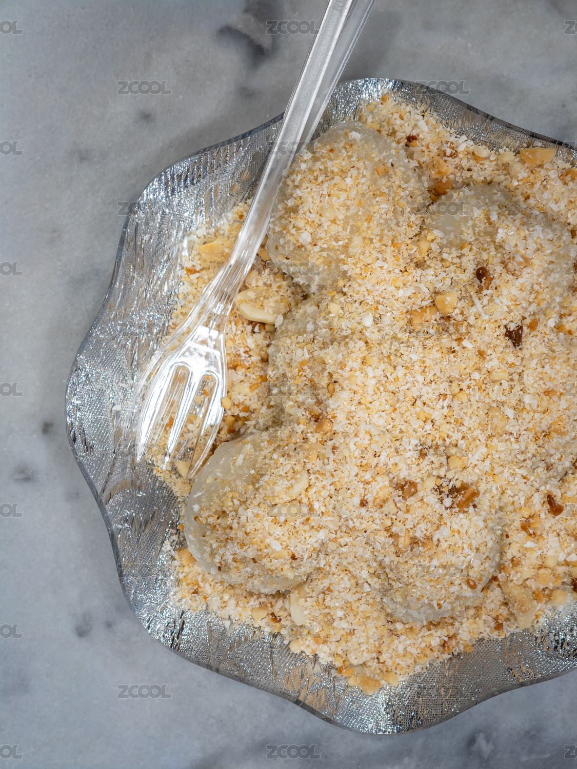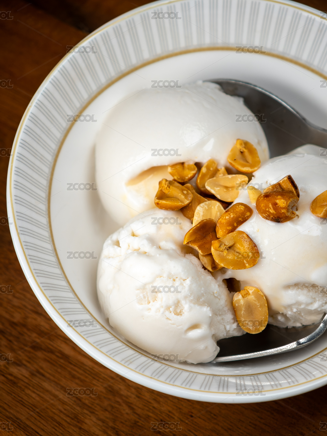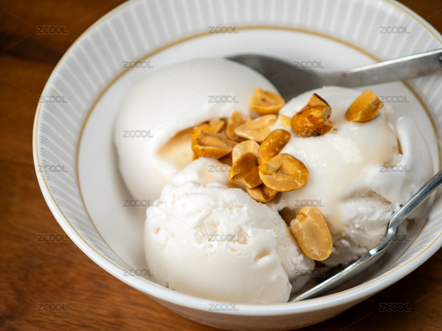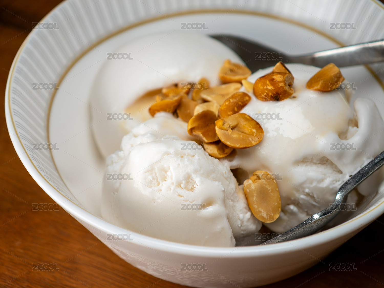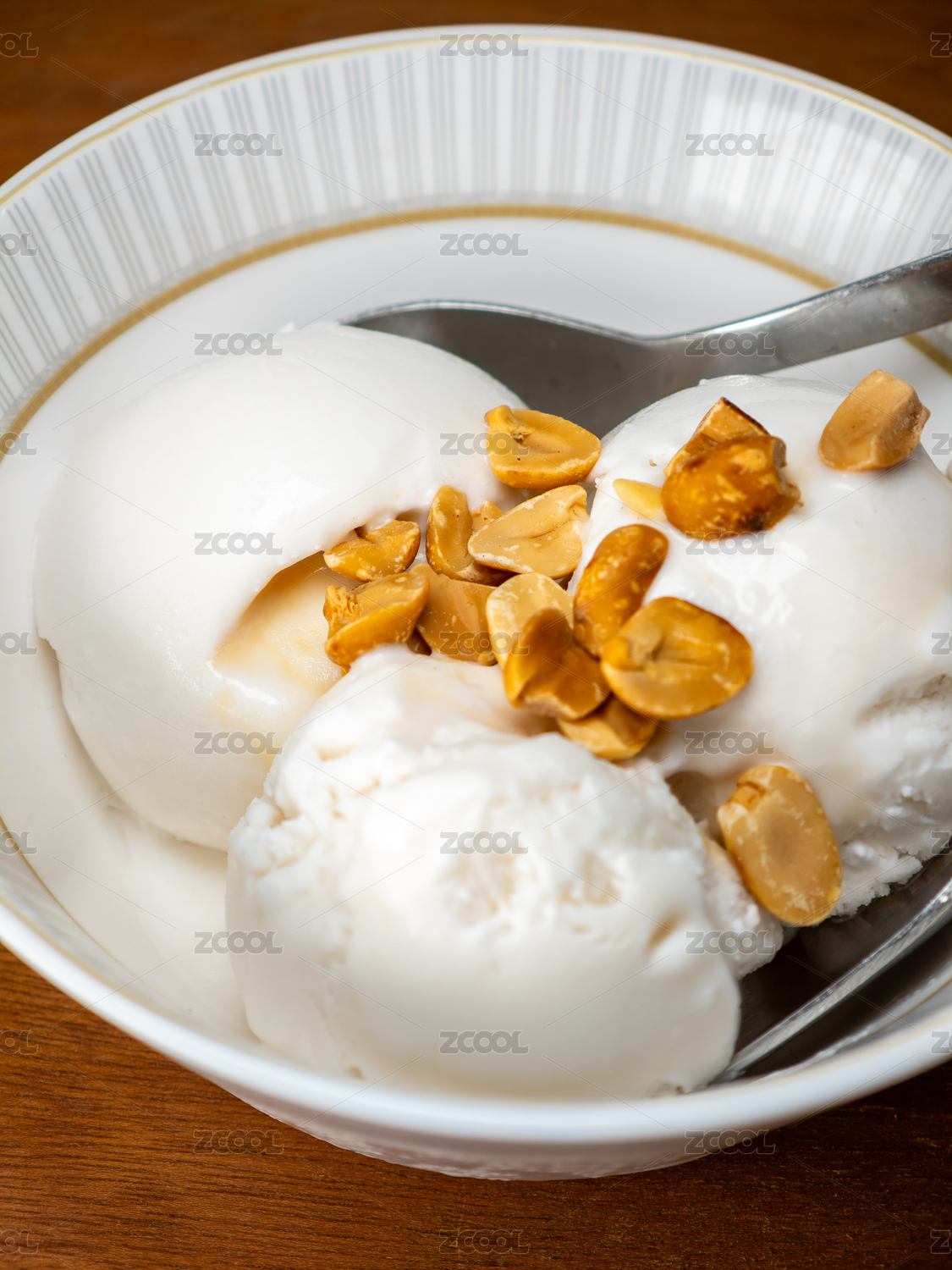 一碗撒上烤花生的椰子冰淇淋