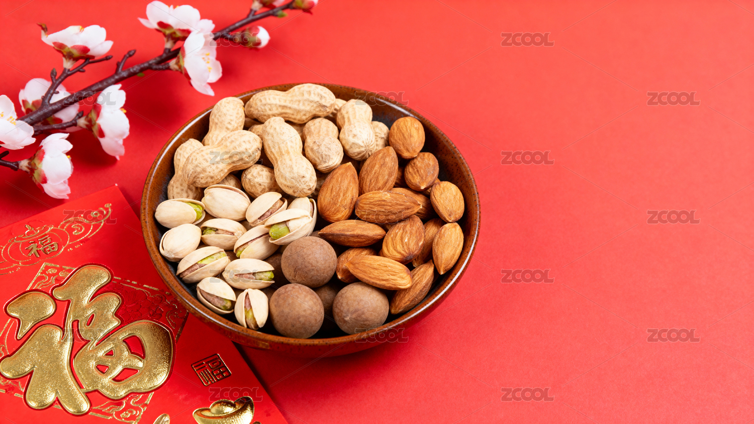 紅色背景堅果與花卉裝飾