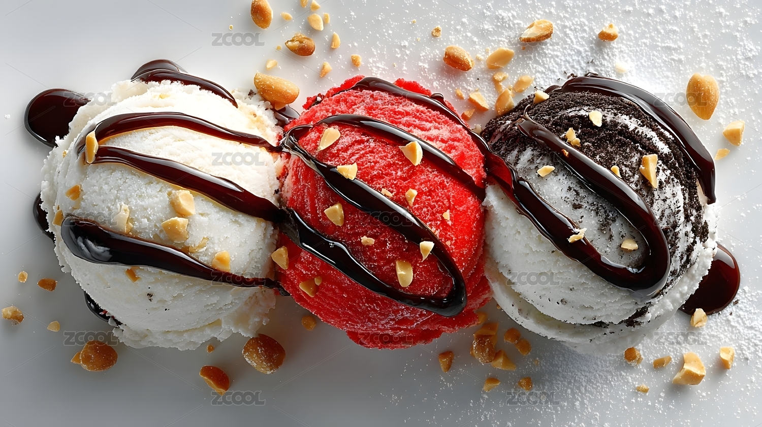 冰淇淋球巧克力醬花生碎