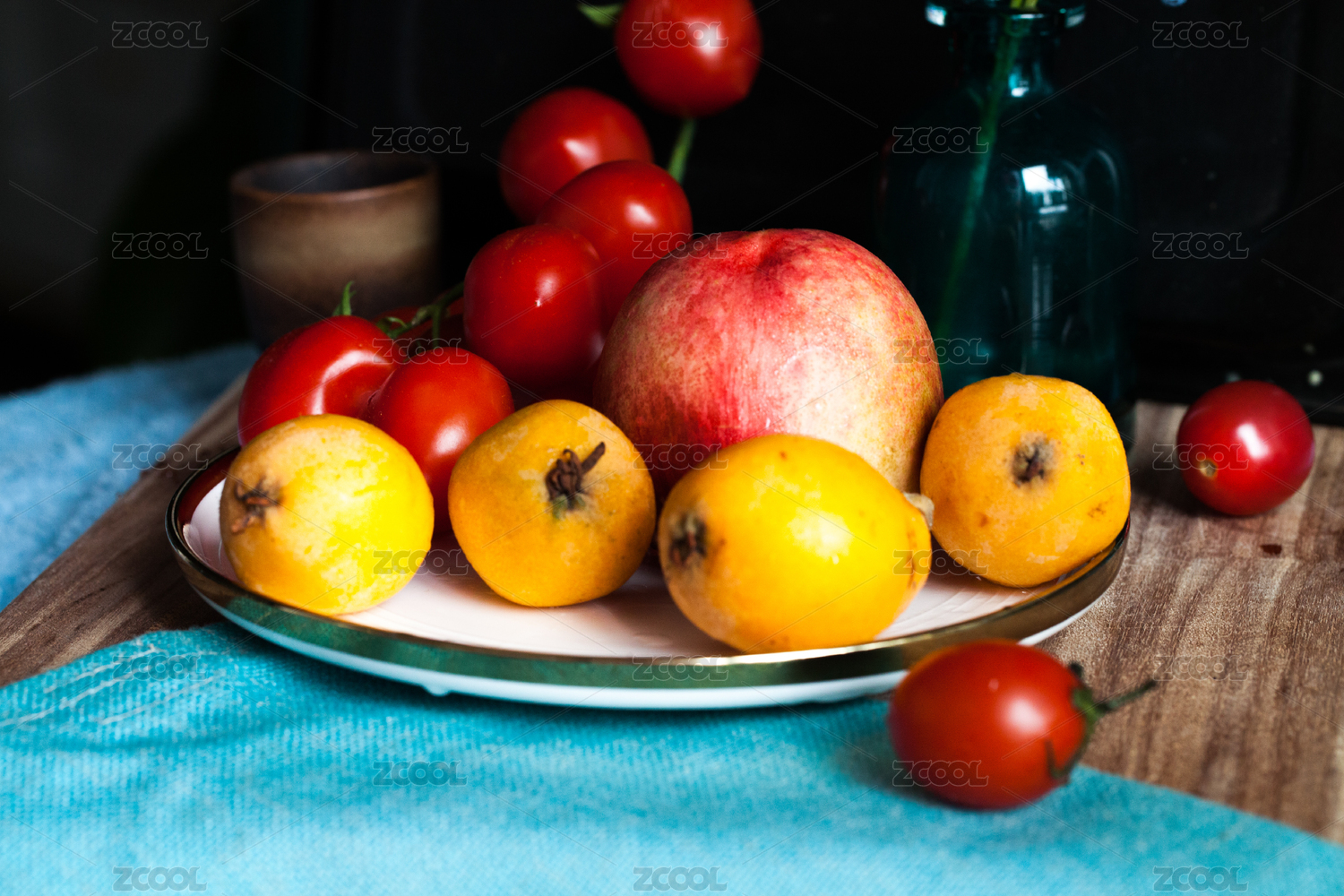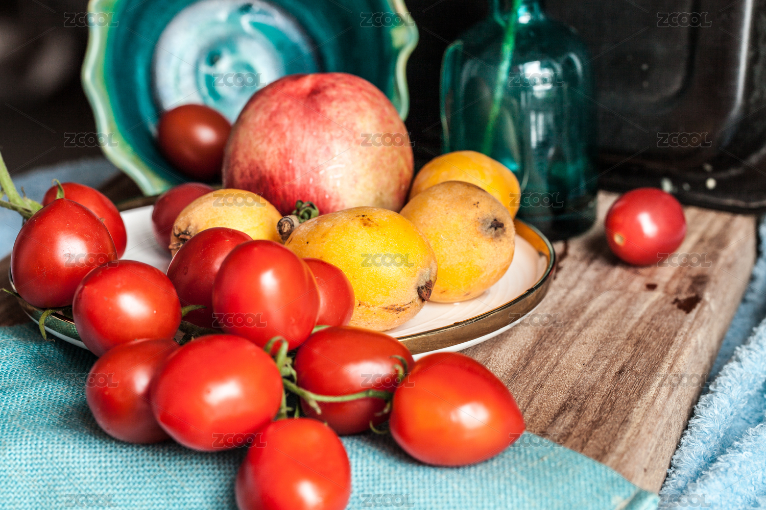 新鮮小番茄桃子枇杷放在白色的盤子里,藍(lán)色的餐布與木菜板