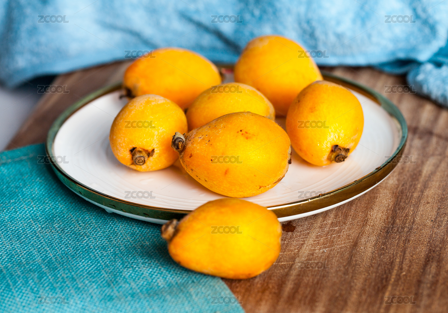 新鮮的枇杷放在白色的盤子里,藍(lán)色的餐布與木菜板