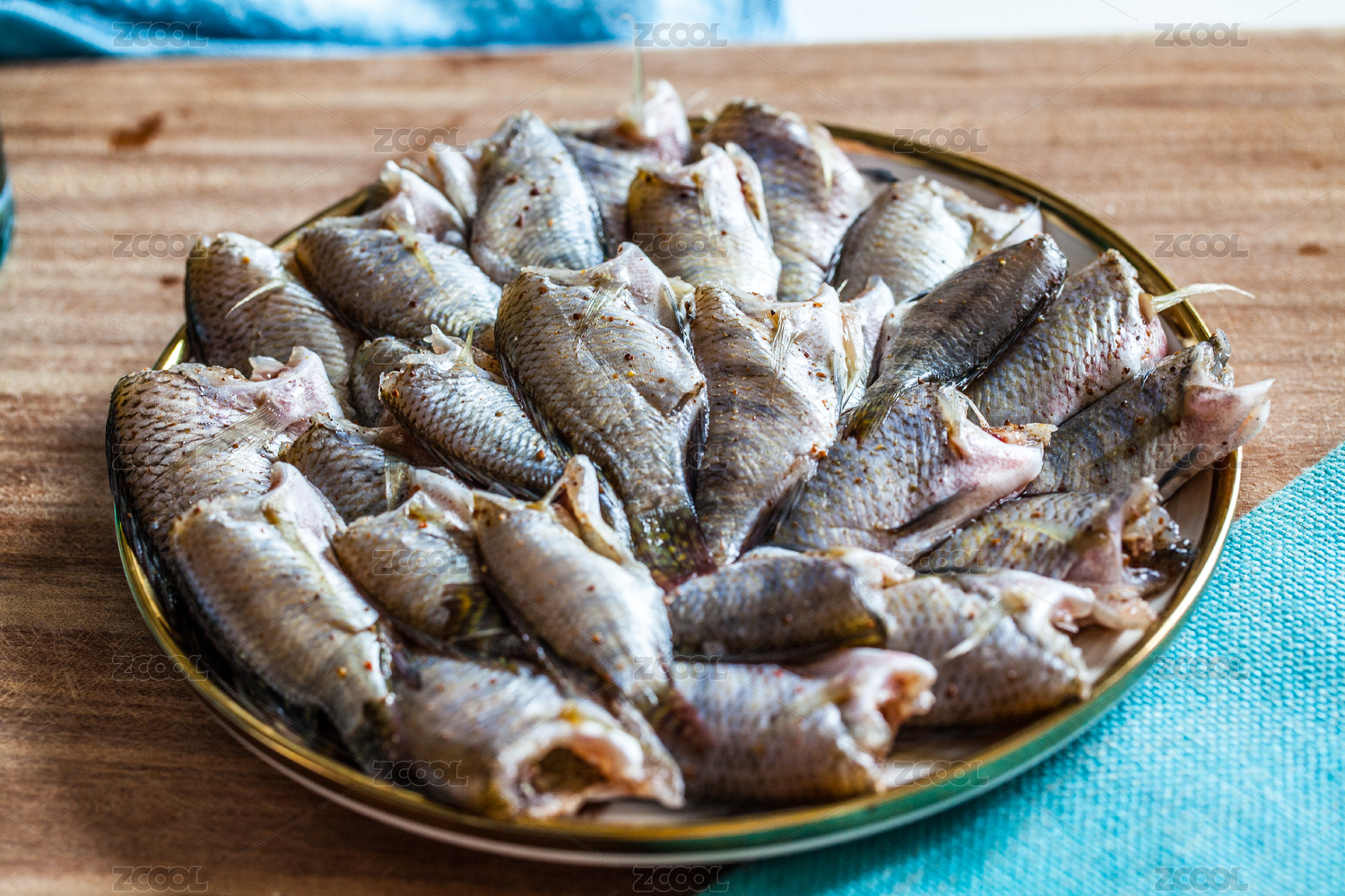烹飪食材羅非魚放在白色的盤子里,藍(lán)色餐布與木菜板