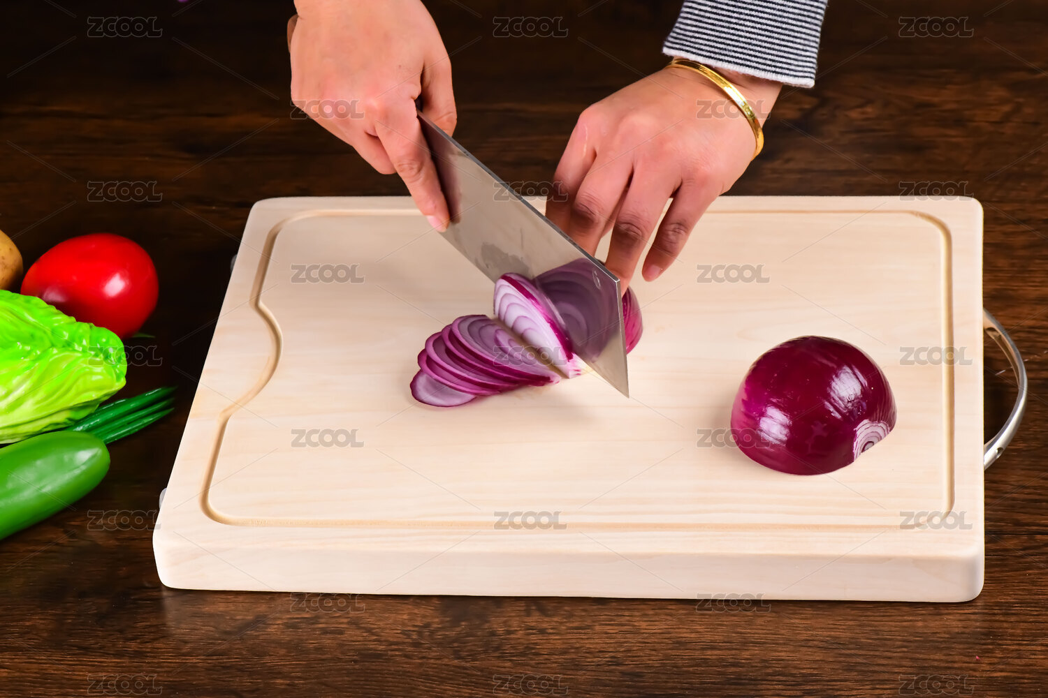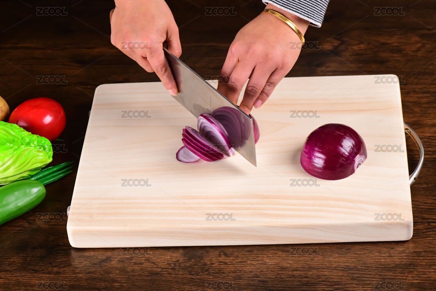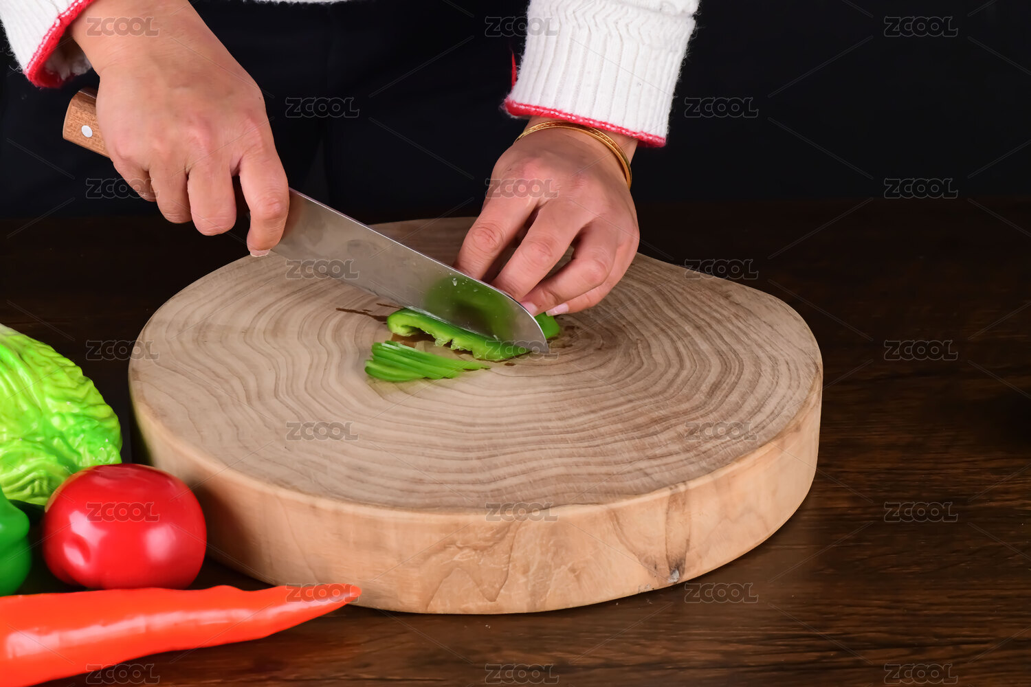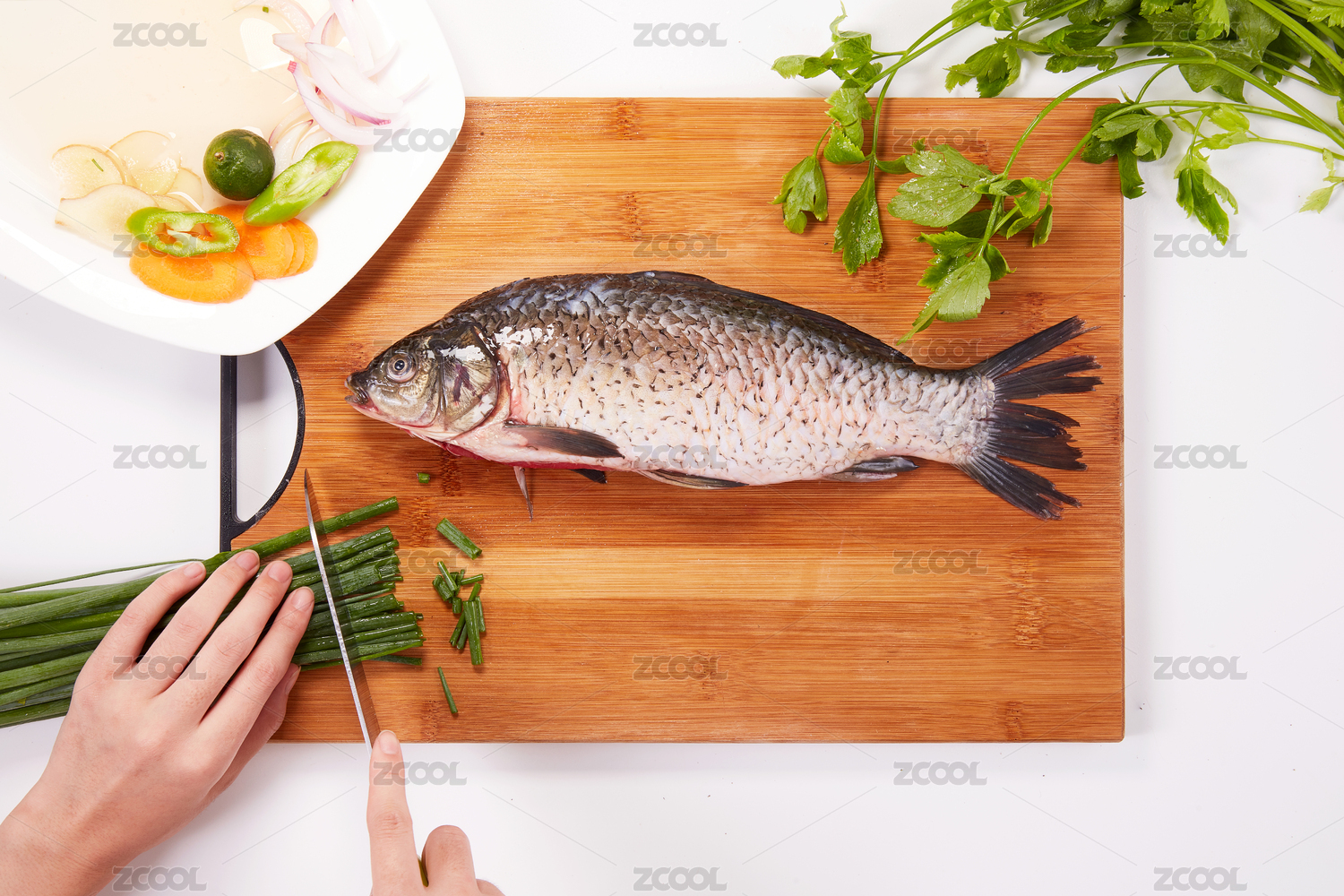 在木菜板上切菜一尾鮮活的魚躺在菜板上