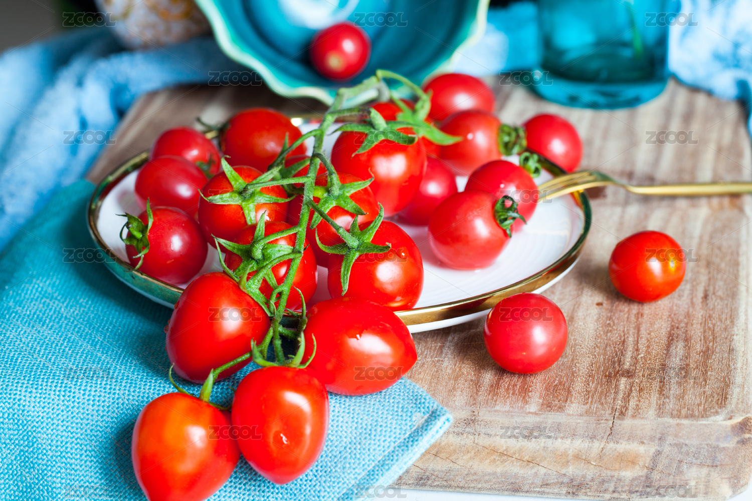 新鮮水果小番茄放在白色的盤子里,藍(lán)色餐布與木菜板