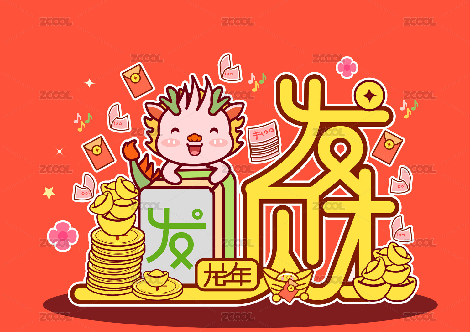龍年手寫漢字龍年發(fā)財金元寶金幣矢量插畫