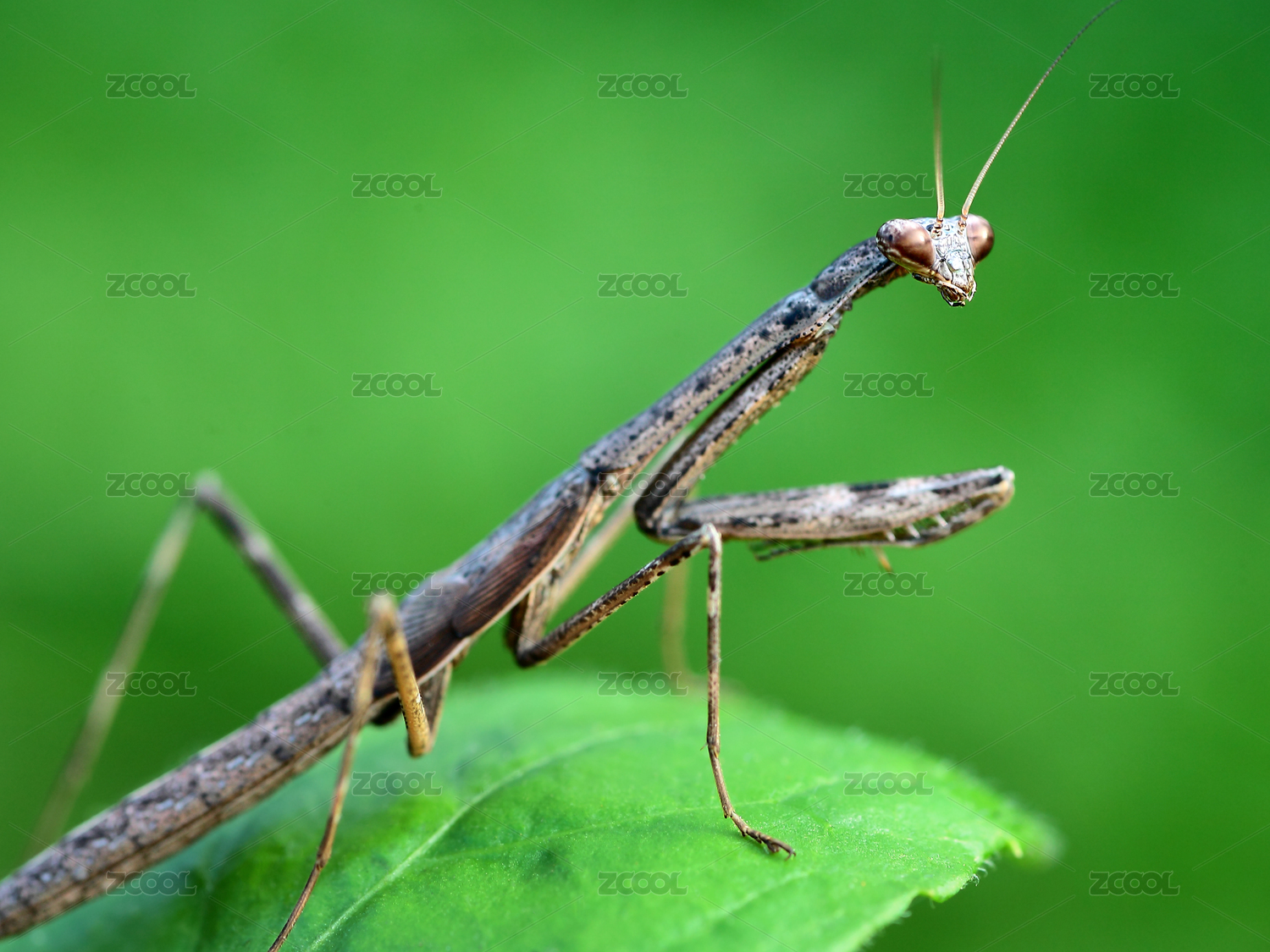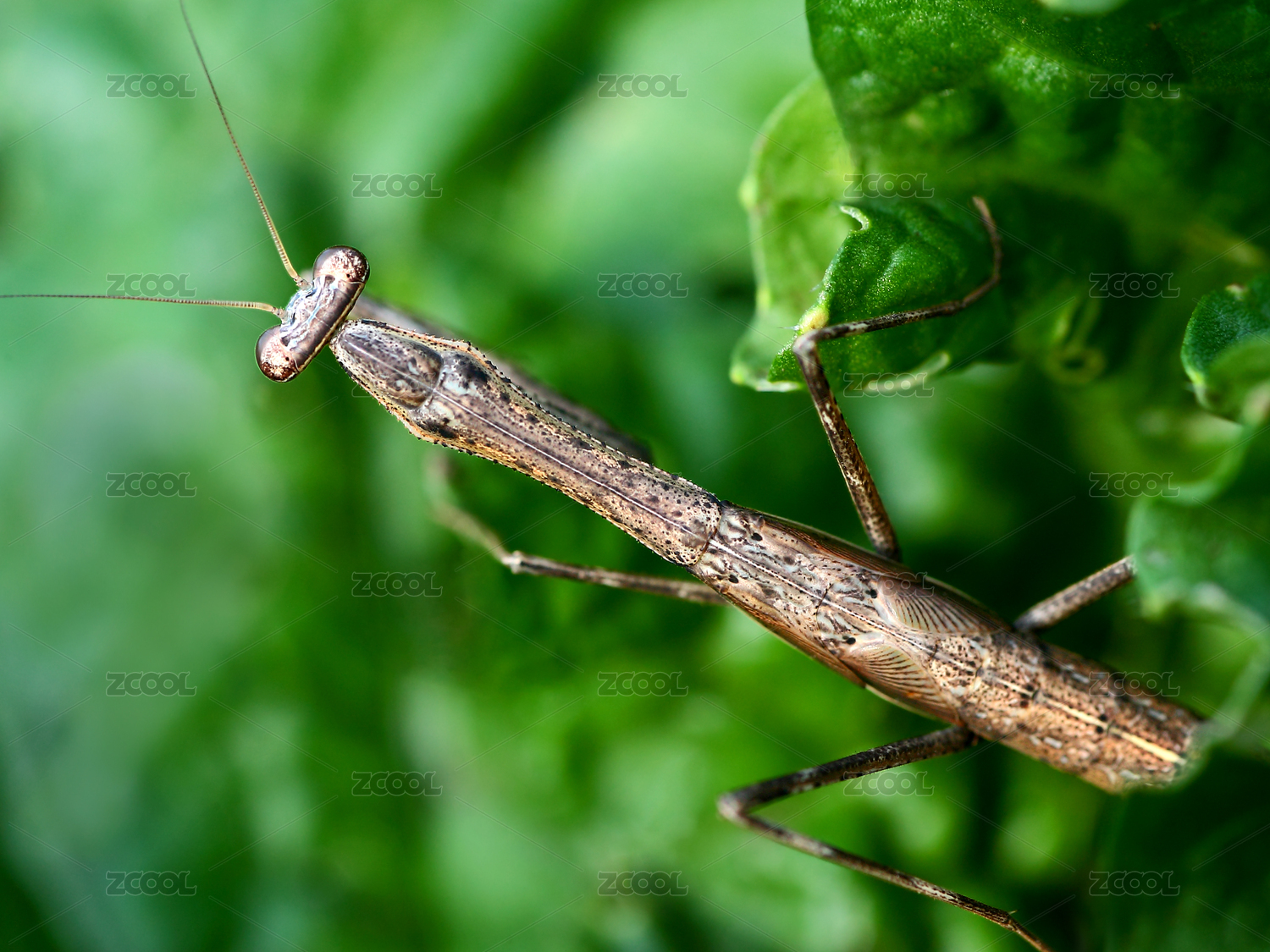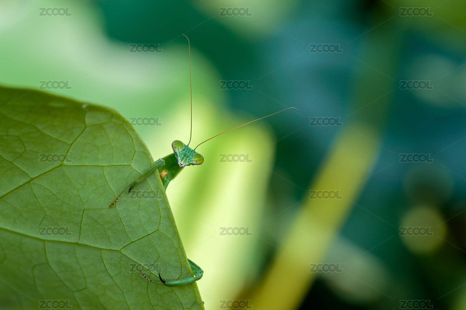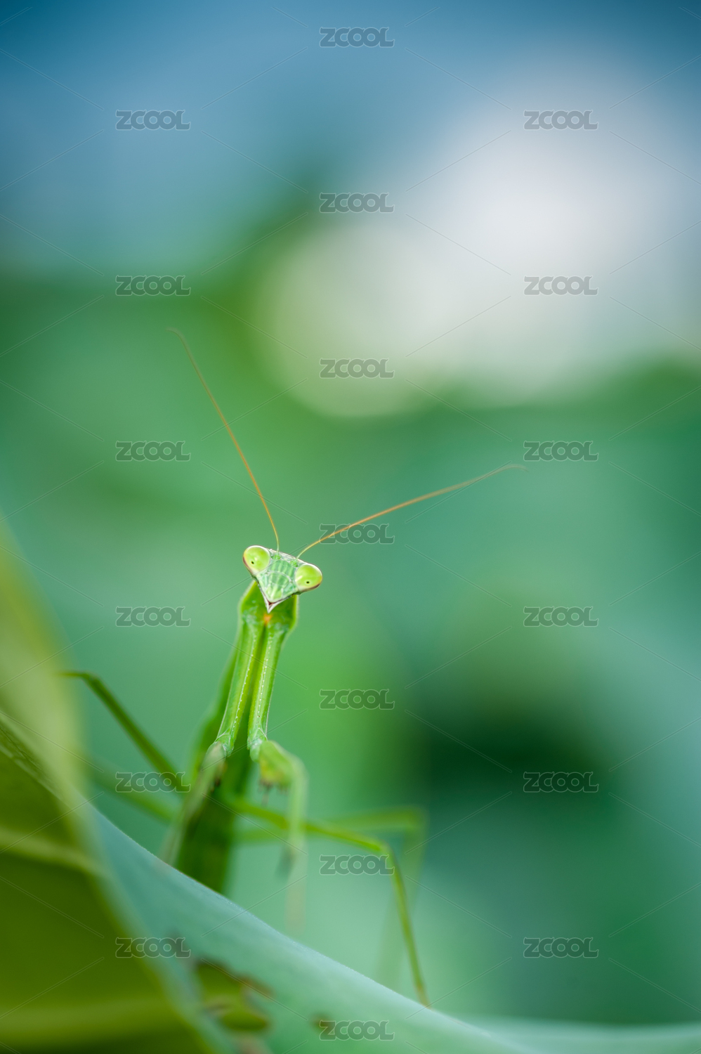 微距拍攝停棲在綠色樹(shù)葉上一臉呆萌的小螳螂