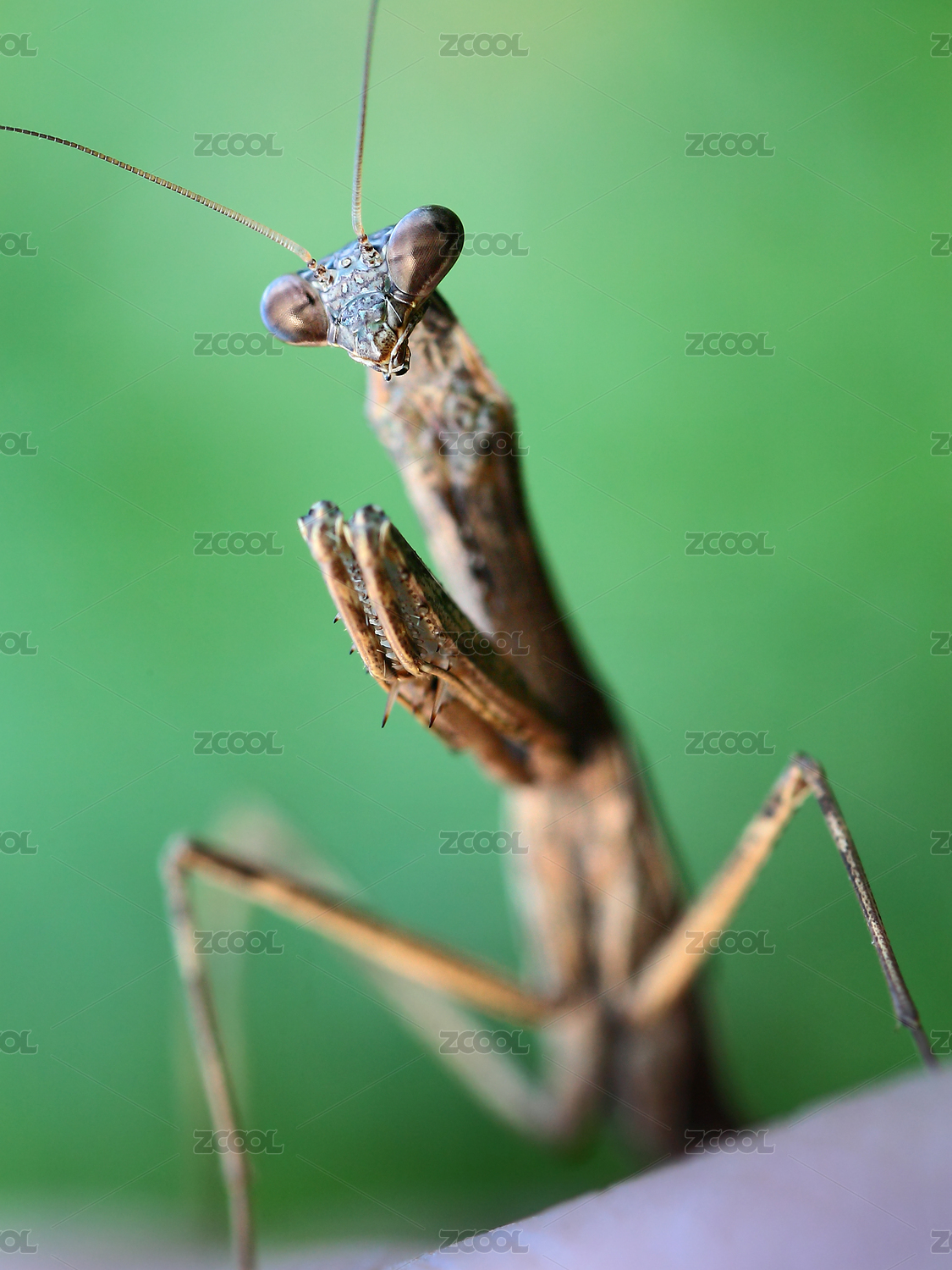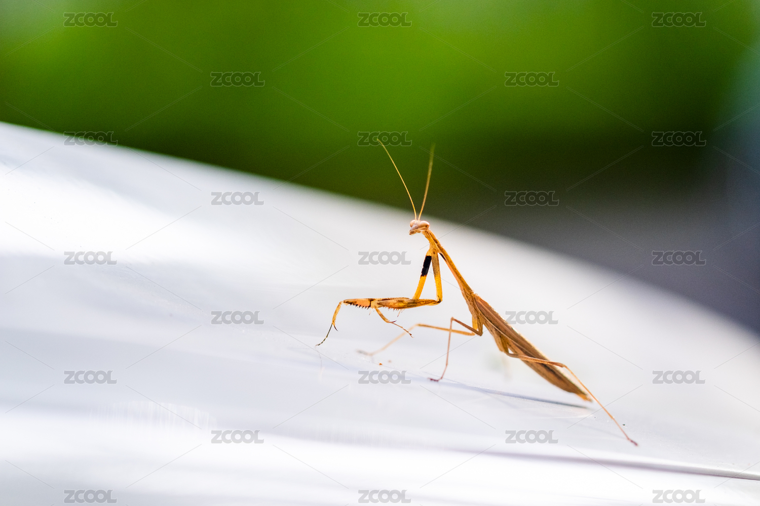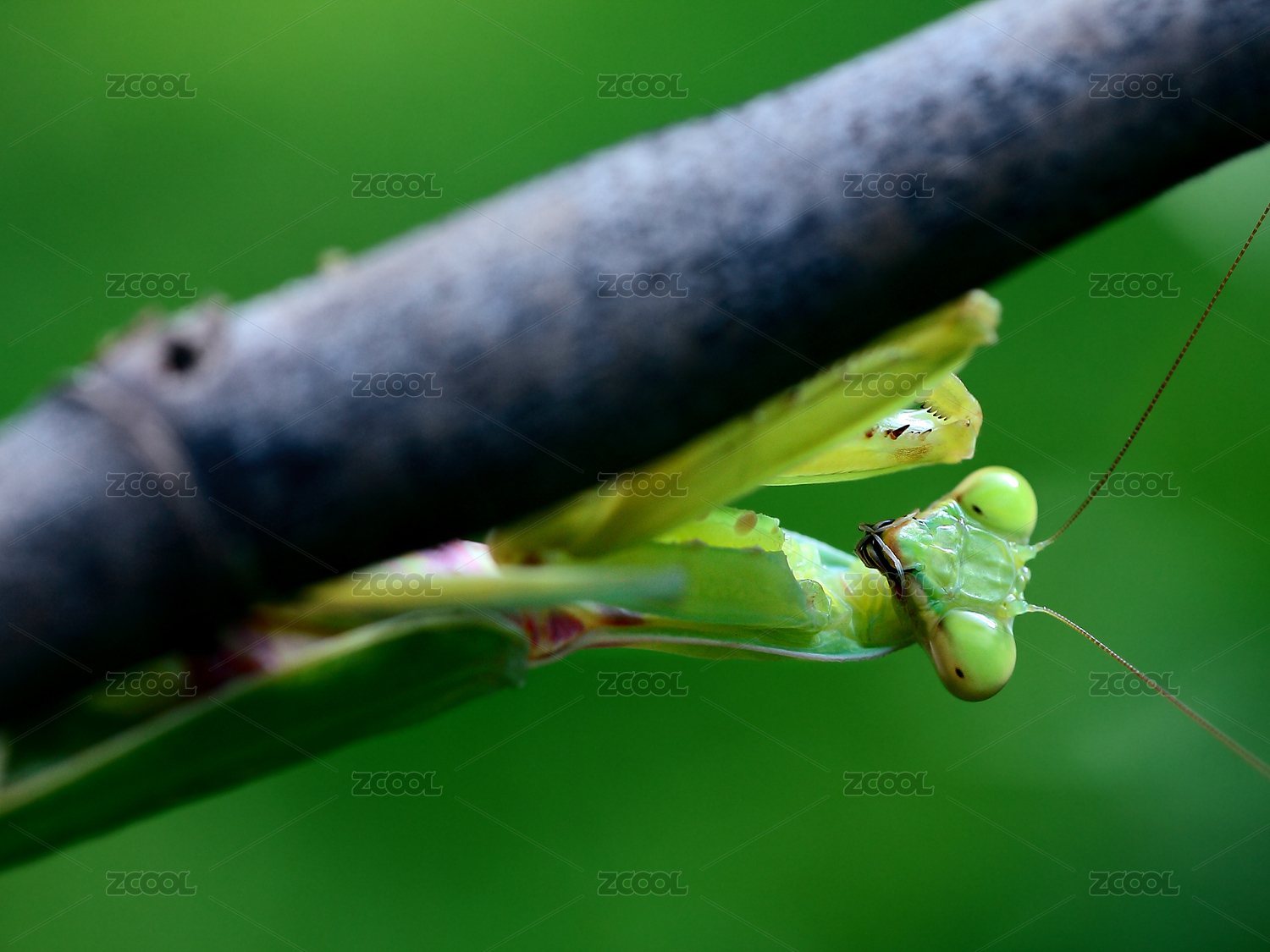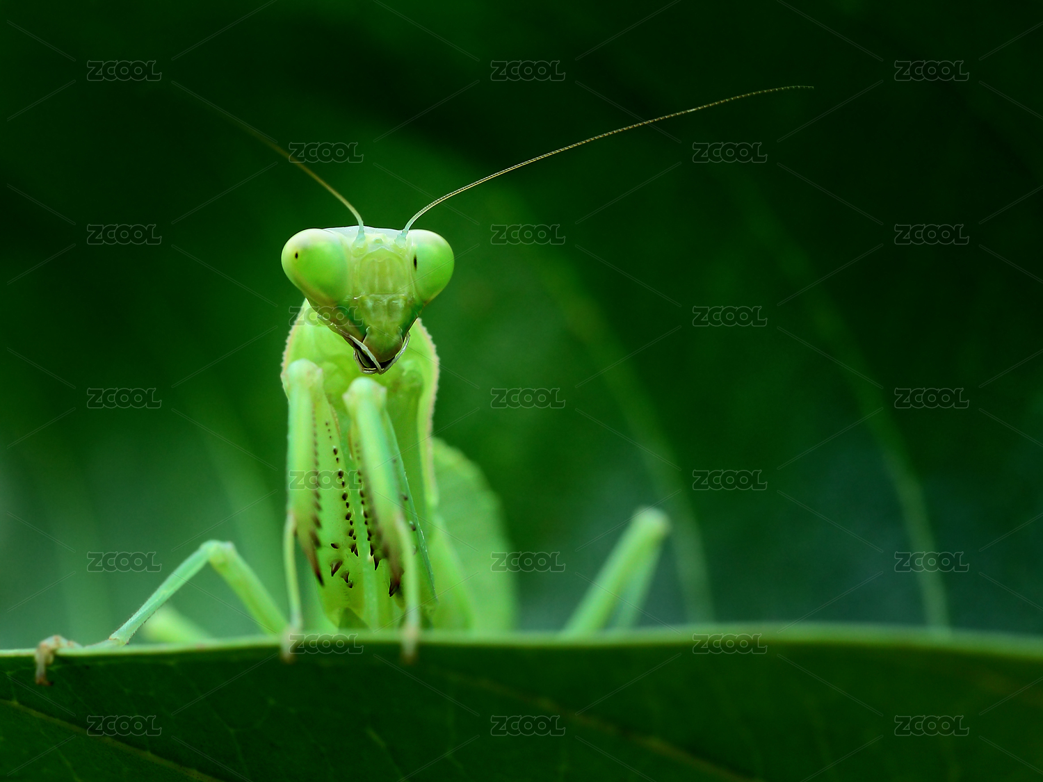 微距拍攝停棲在綠色樹(shù)葉上一臉呆萌的小螳螂