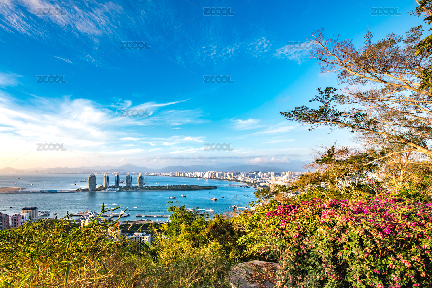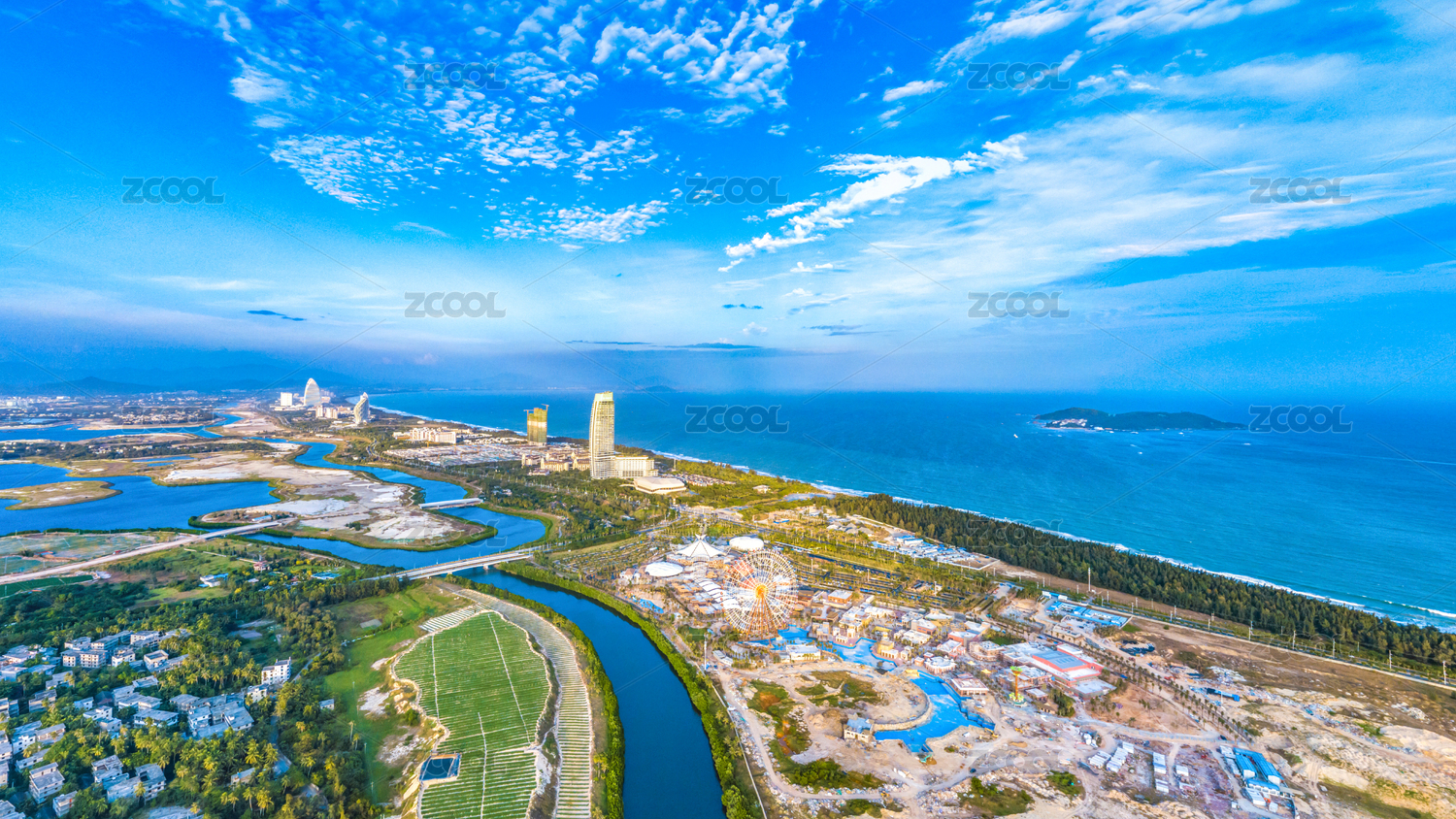 Aerial View of Cruise Home Port and Luxury Hotels on Phoenix Island, Landmark Architecture of Sanya City, Hainan Province, China
