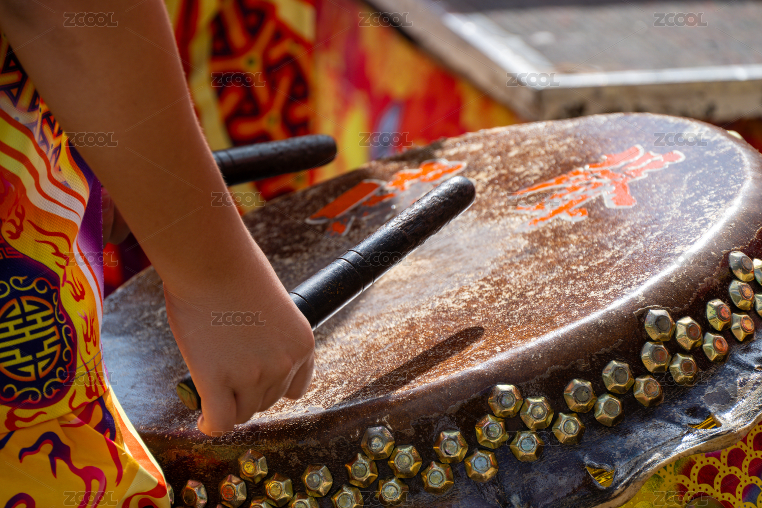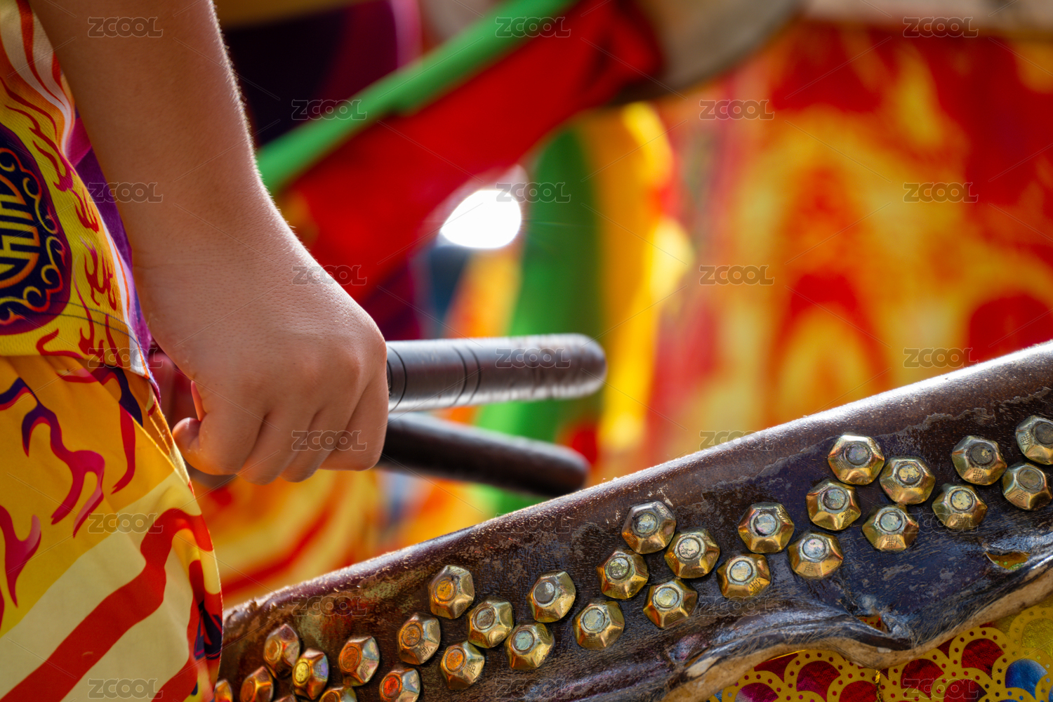 手握鼓槌敲擊傳統(tǒng)鼓面的特寫