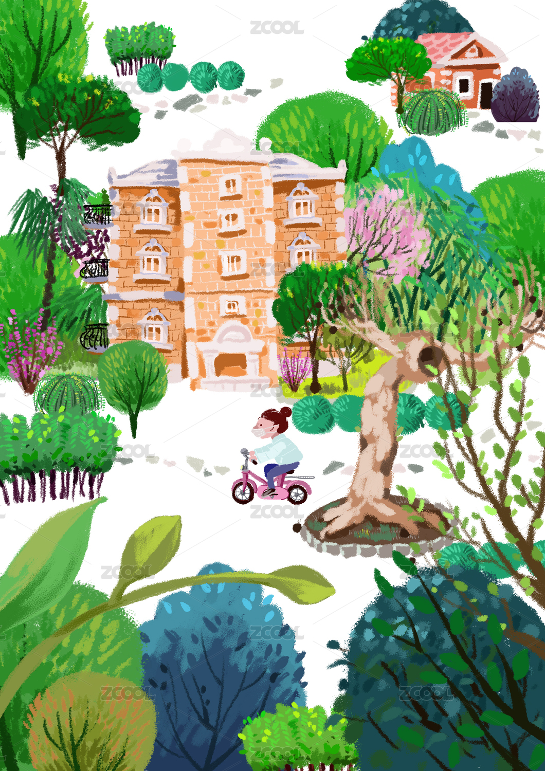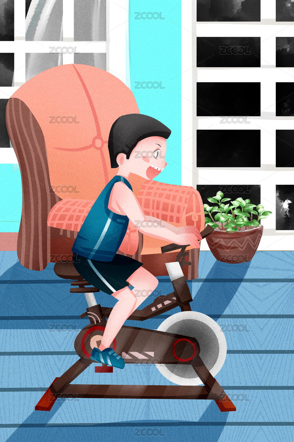 小清新風(fēng)格男孩在家騎腳踏車鍛煉身體插畫