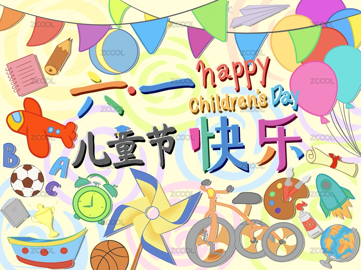 兒童節(jié)彩旗玩具文具氣球腳踏車彩色卡通海報(bào)