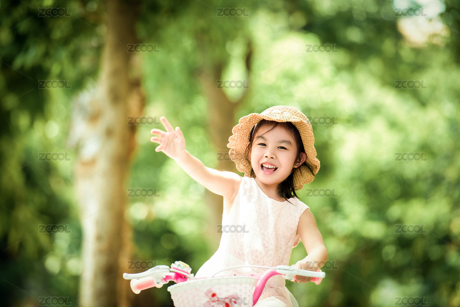 帶著帽子騎著腳踏車正在開心的向?qū)γ嬲惺值膩喼拗袊?guó)小女孩
