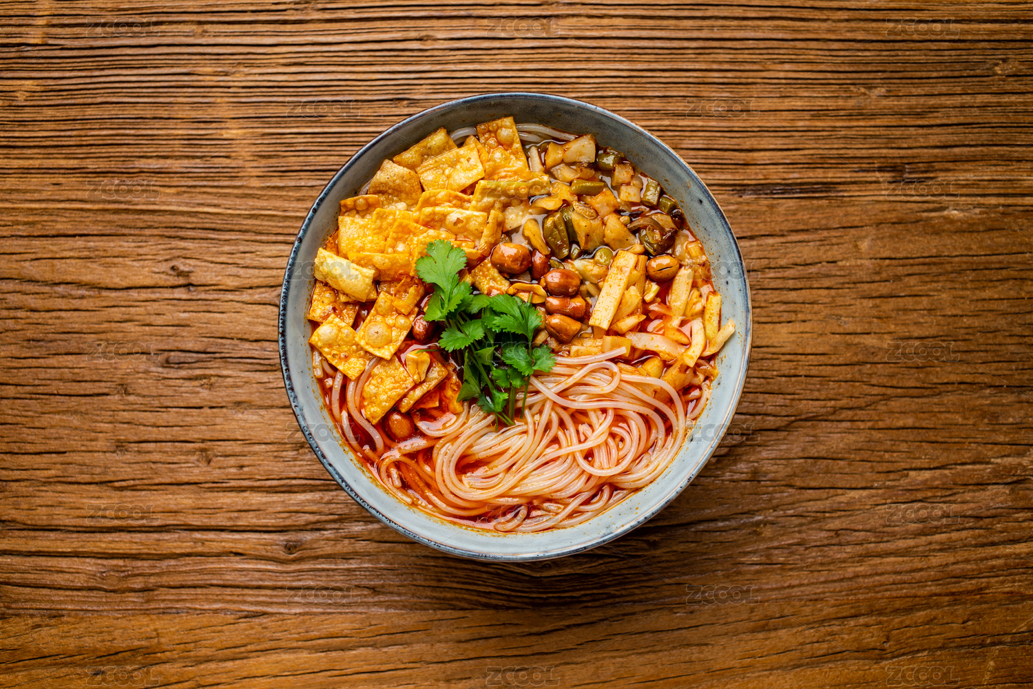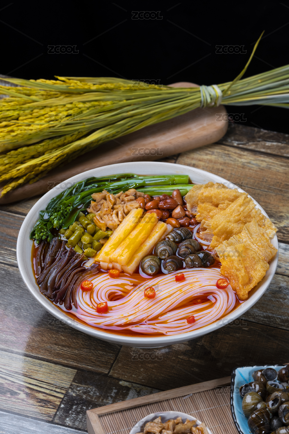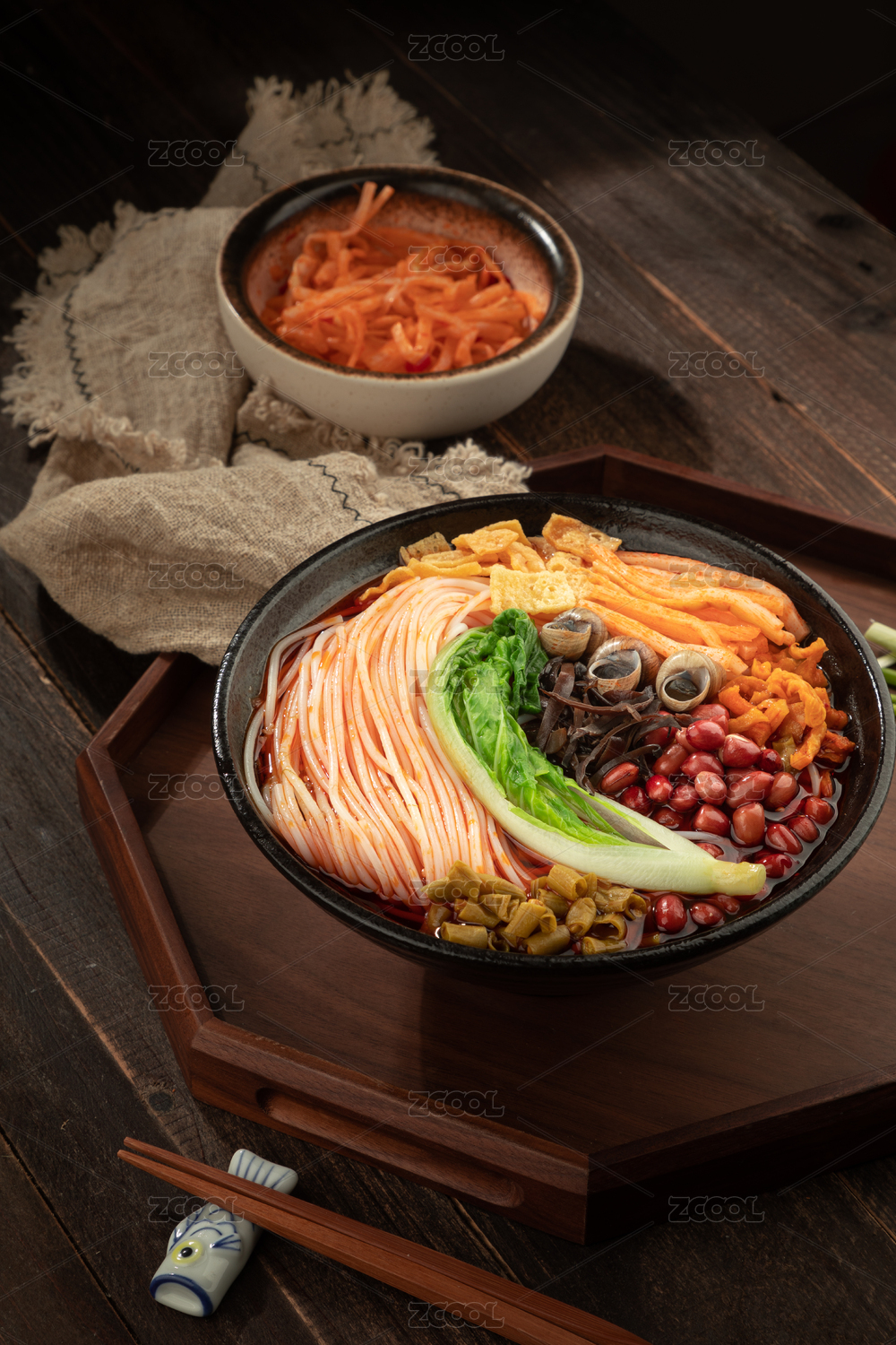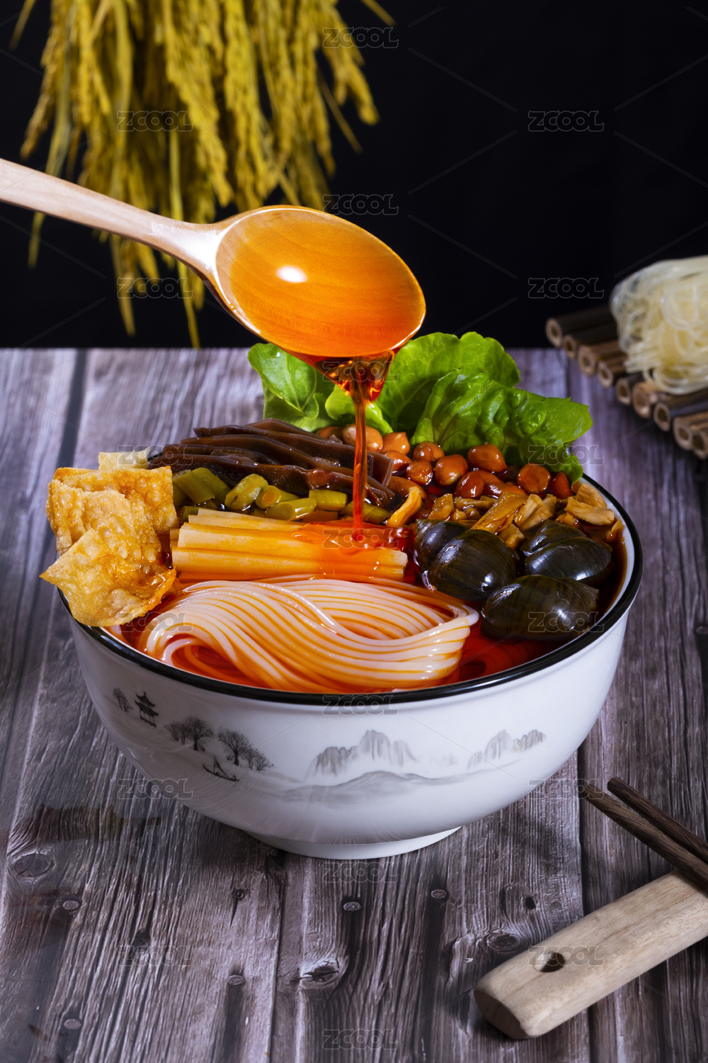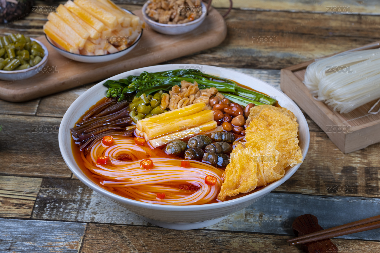 美味的廣西柳州螺螄粉,在木質(zhì)的桌面背景