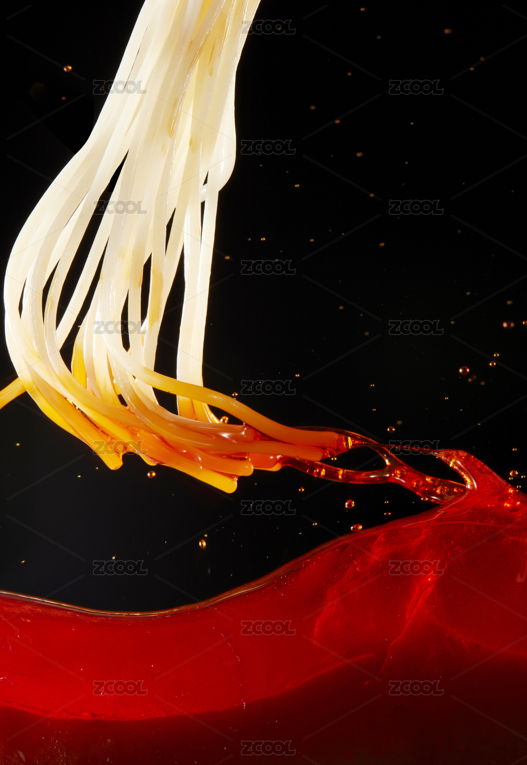 特寫跳躍的米粉,帶著螺螄粉的紅油湯汁