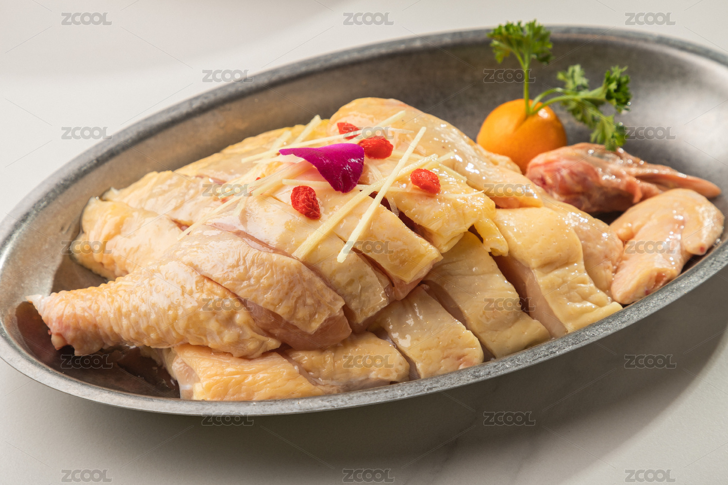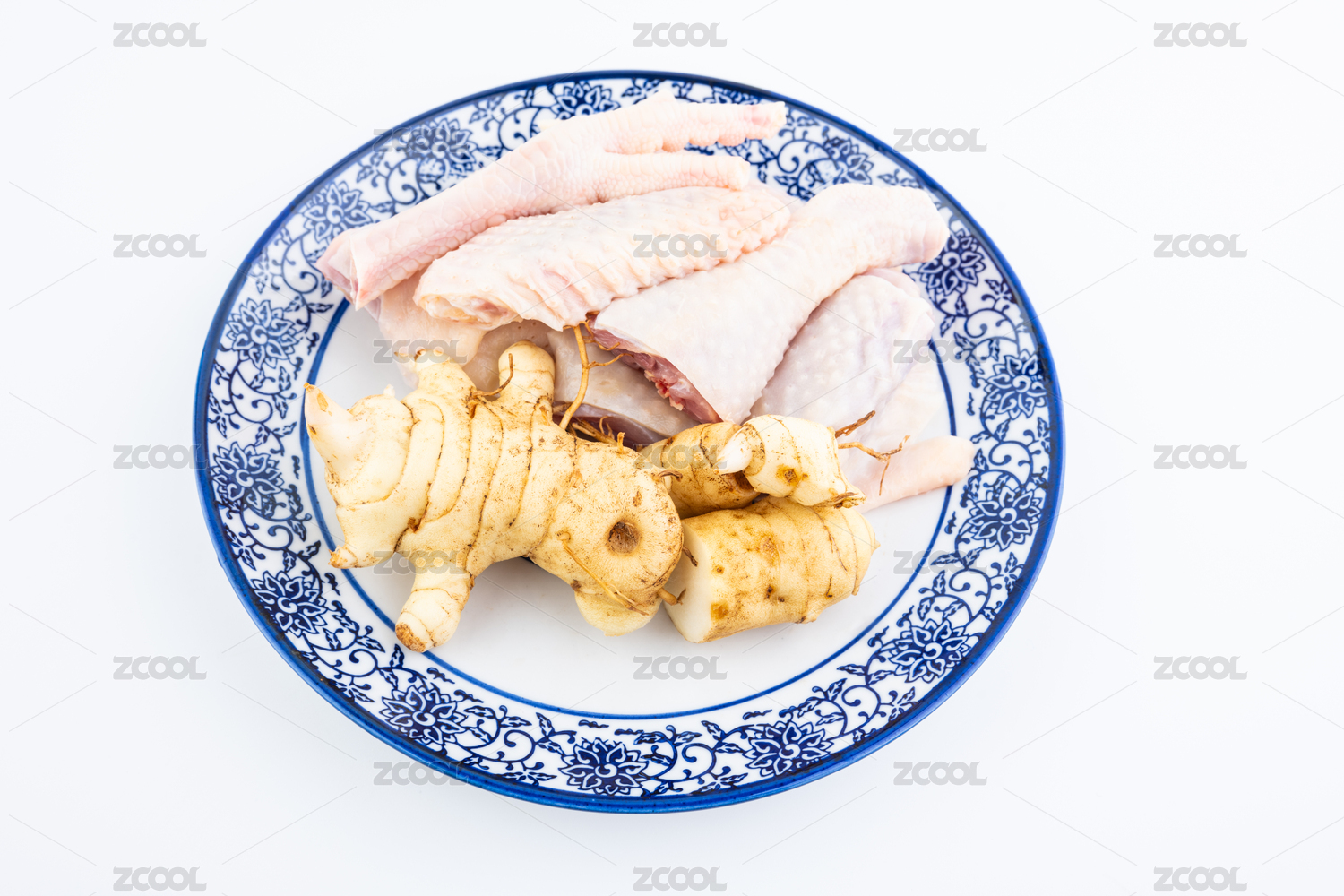 白背景上碟子裝著半邊新鮮雞肉和滋補(bǔ)湯料
