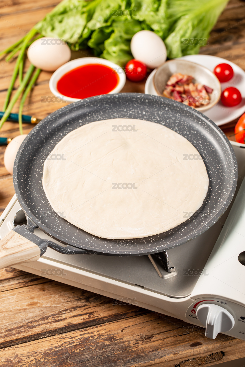 一片手抓餅皮放在木板背景上的平底鍋里