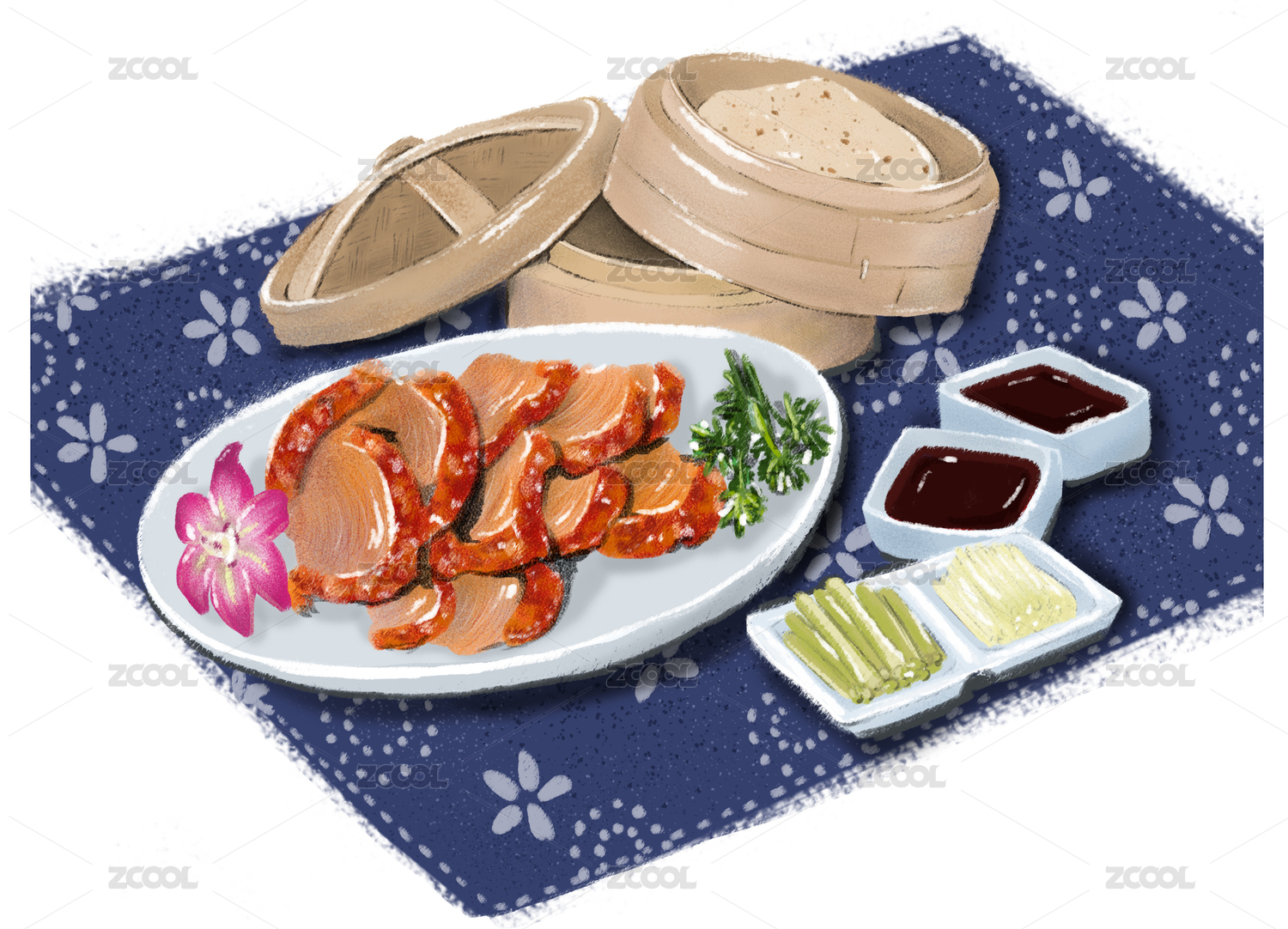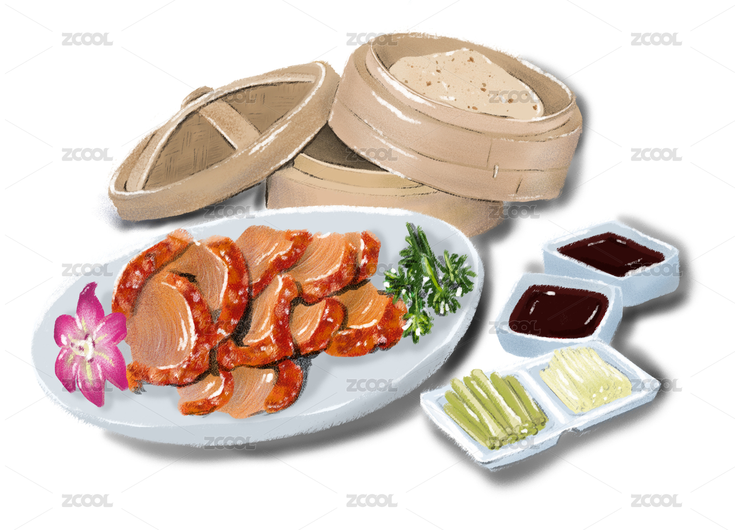 片好的烤鴨黃瓜條蔥絲烤鴨醬和籠屜里的餅