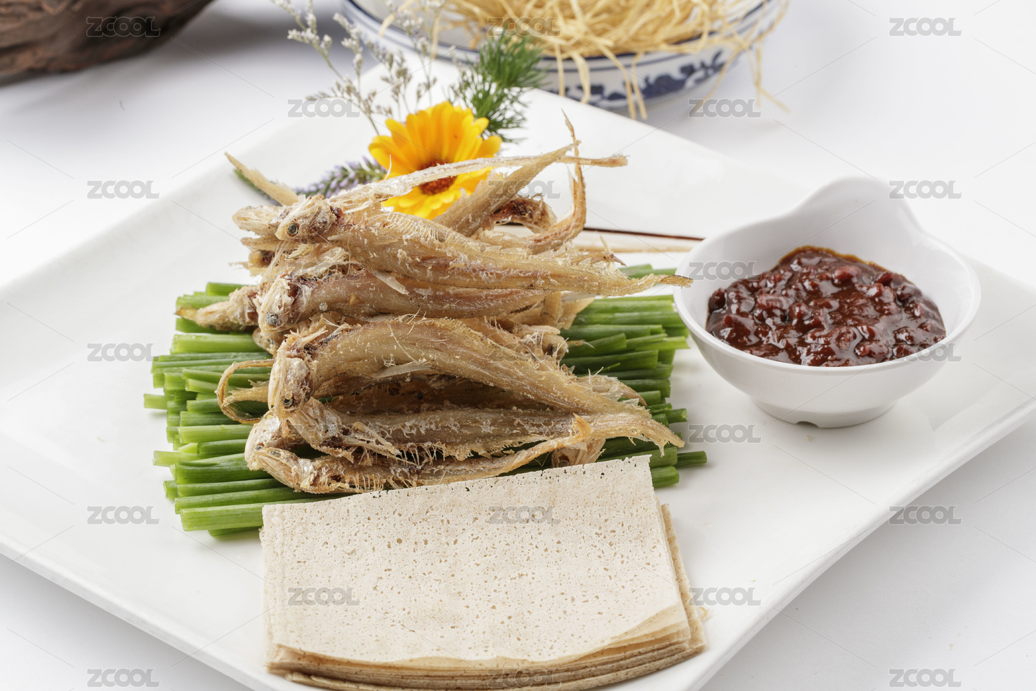 白色瓷盤裝的煎餅皮卷干炸銀魚