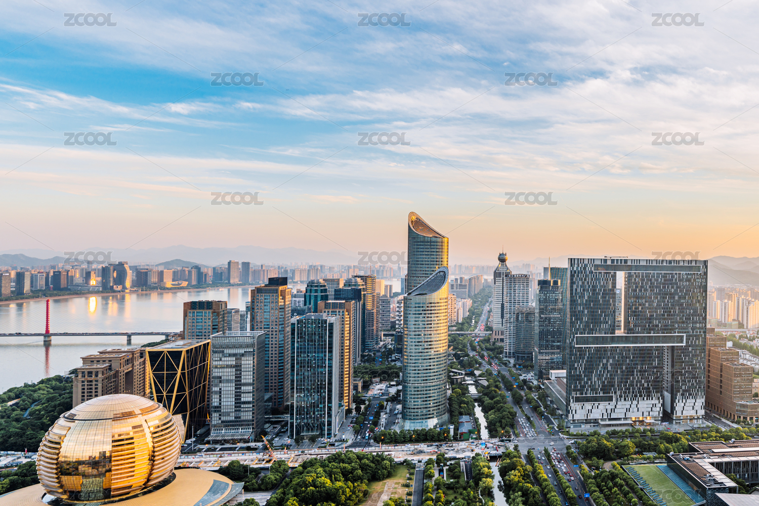中國(guó)浙江杭州城市天際線黃昏風(fēng)光