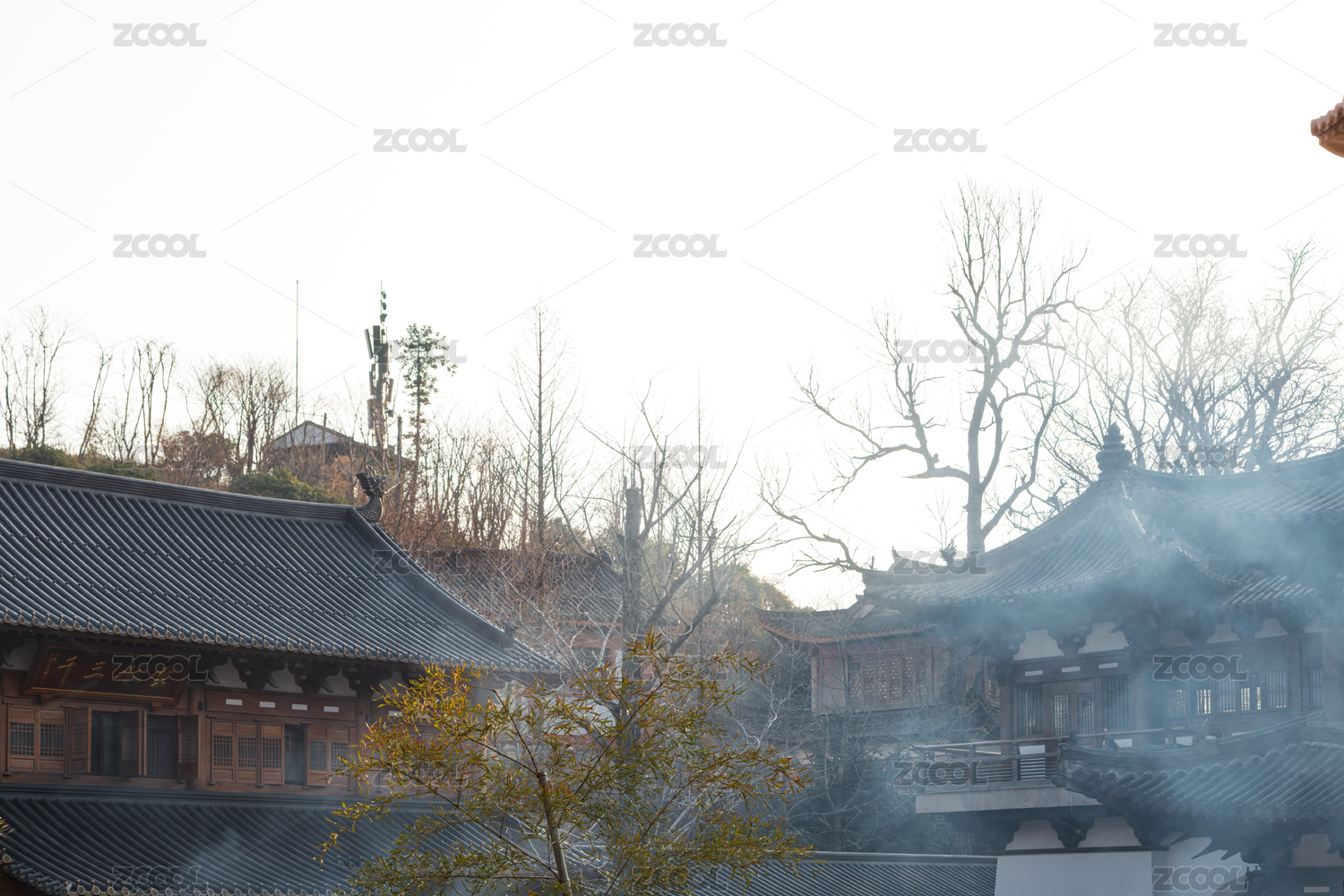 浙江杭州徑山寺古寺晨霧中的寧?kù)o景象