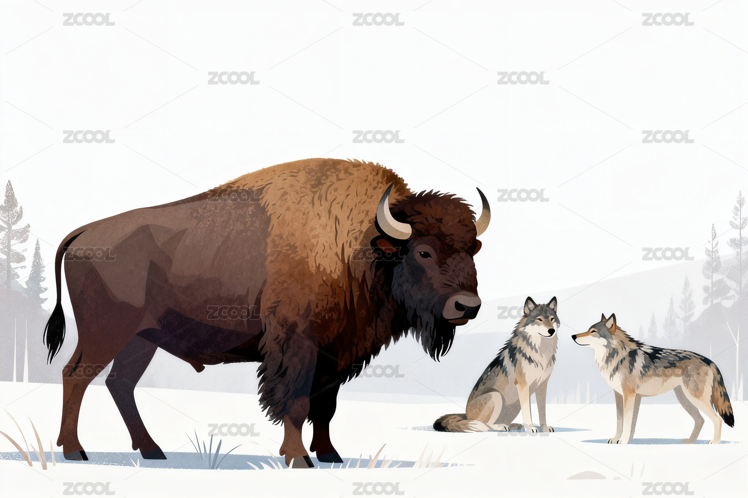 野牛與狼群雪地對(duì)峙