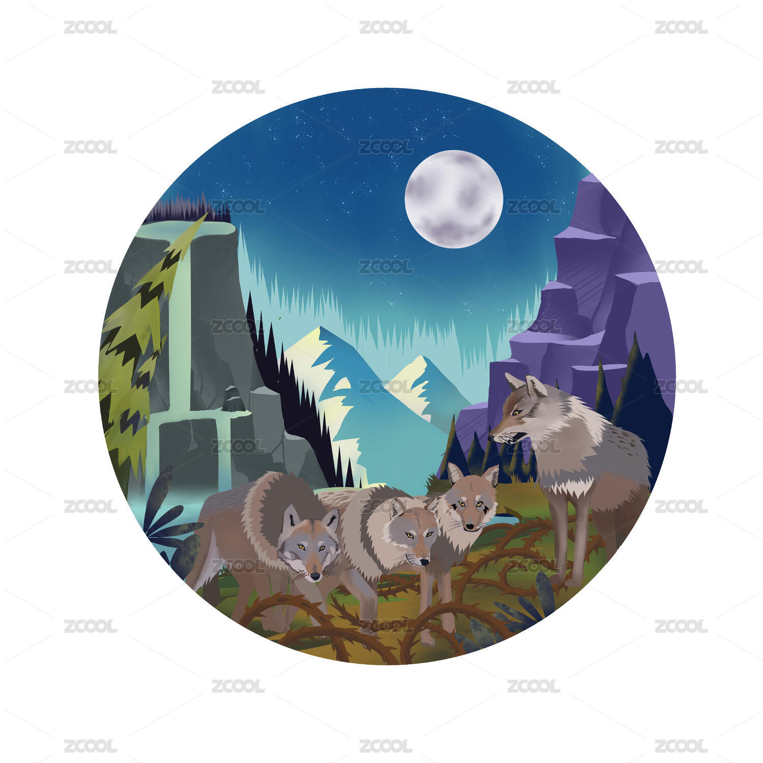 月夜山下的狼群插畫