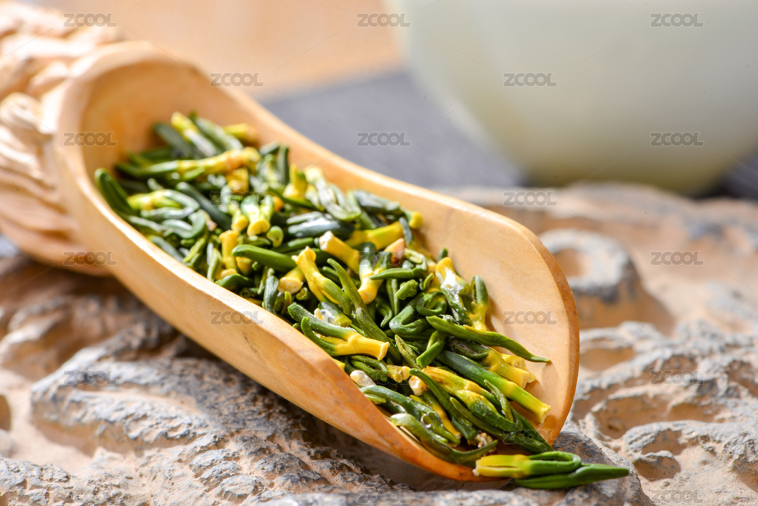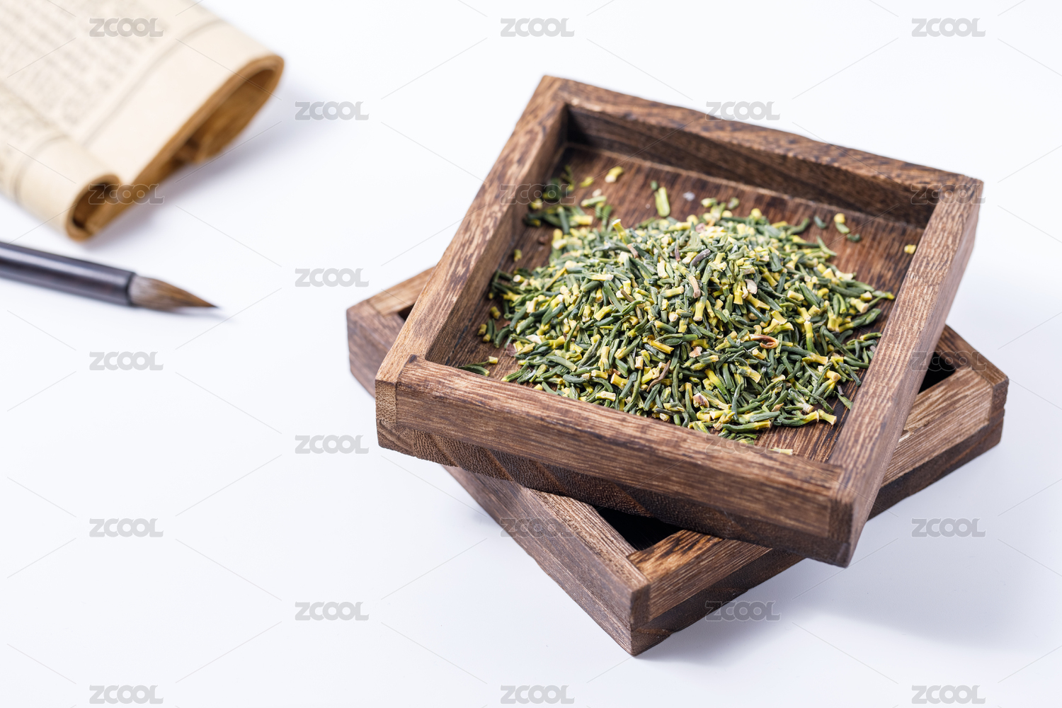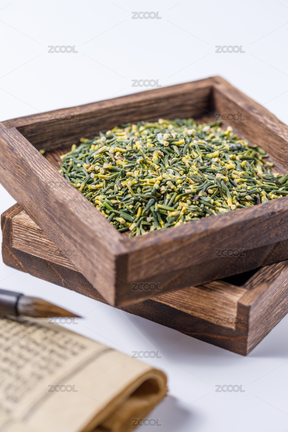白色背景上放在木盒里的中國藥材蓮子心